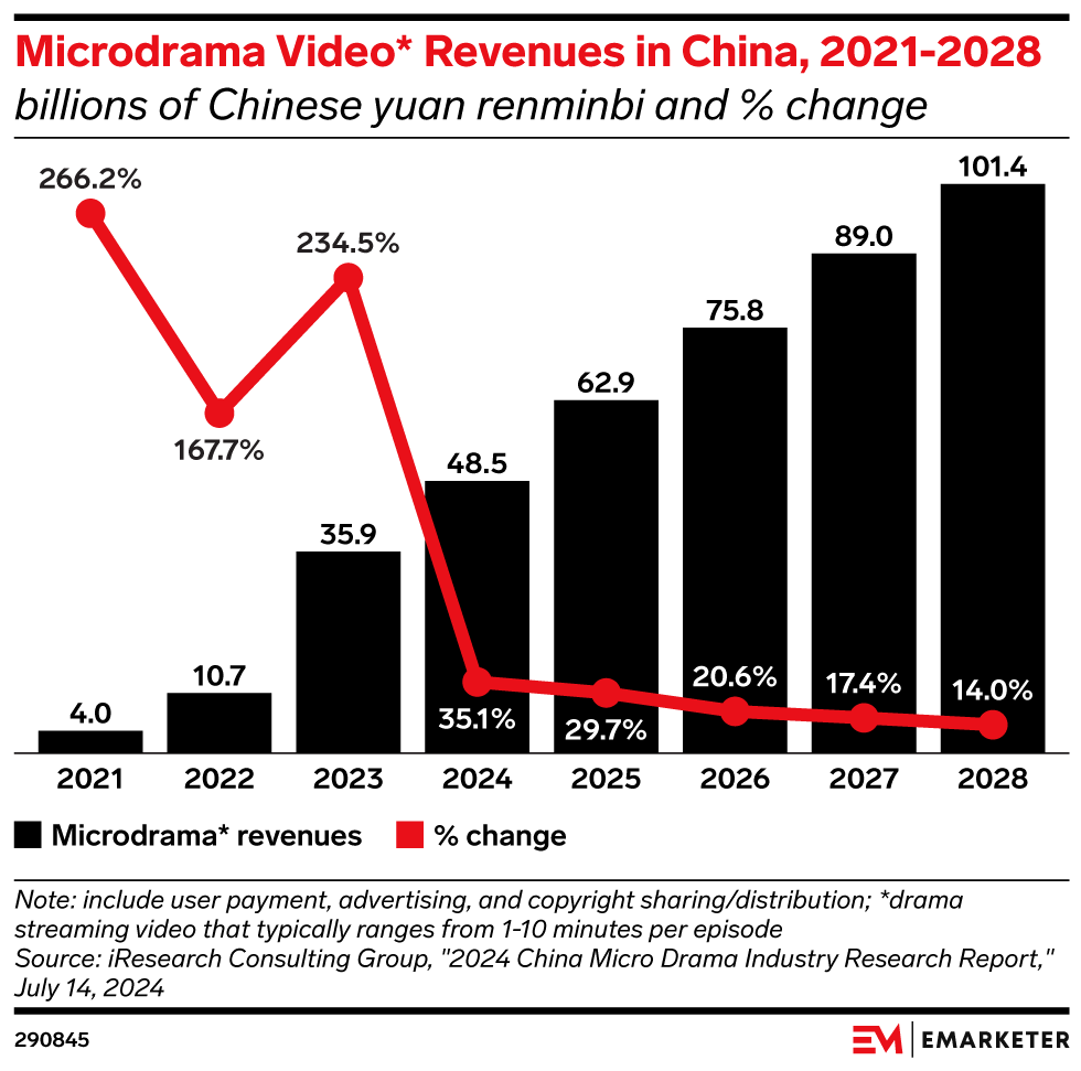 Microdrama revenues are surging too, more than doubling from RMB 48.5 billion ($6.76 billion) in 2024 to a projected RMB 101.4 billion ($14.15 billion) by 2028 in China, according to iResearch Consulting Group. The content type is increasingly seen as a viable business among many Chinese tech companies.