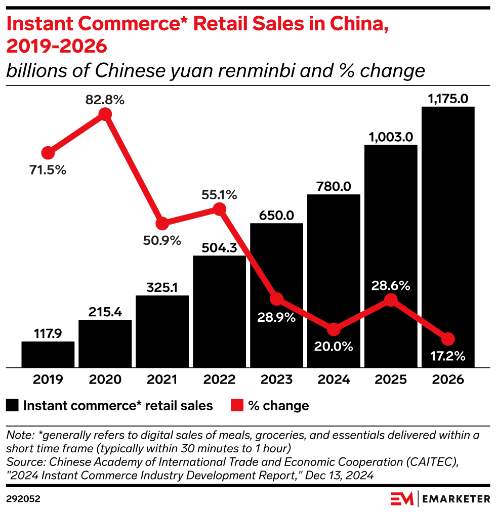 An intense price war, new entrants, and new investments are fueling China’s booming instant commerce sector. Sales are expected to outpace total retail ecommerce, making lower-tier cities the next battleground.