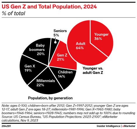 With the youngest of the cohort turning 12 in 2024, Gen Zers are growing up. Adult Gen Zers now constitute 17% of the US adult population. As the older members of this generation age further into adulthood and the workforce, their purchase habits will help shape larger consumer trends.