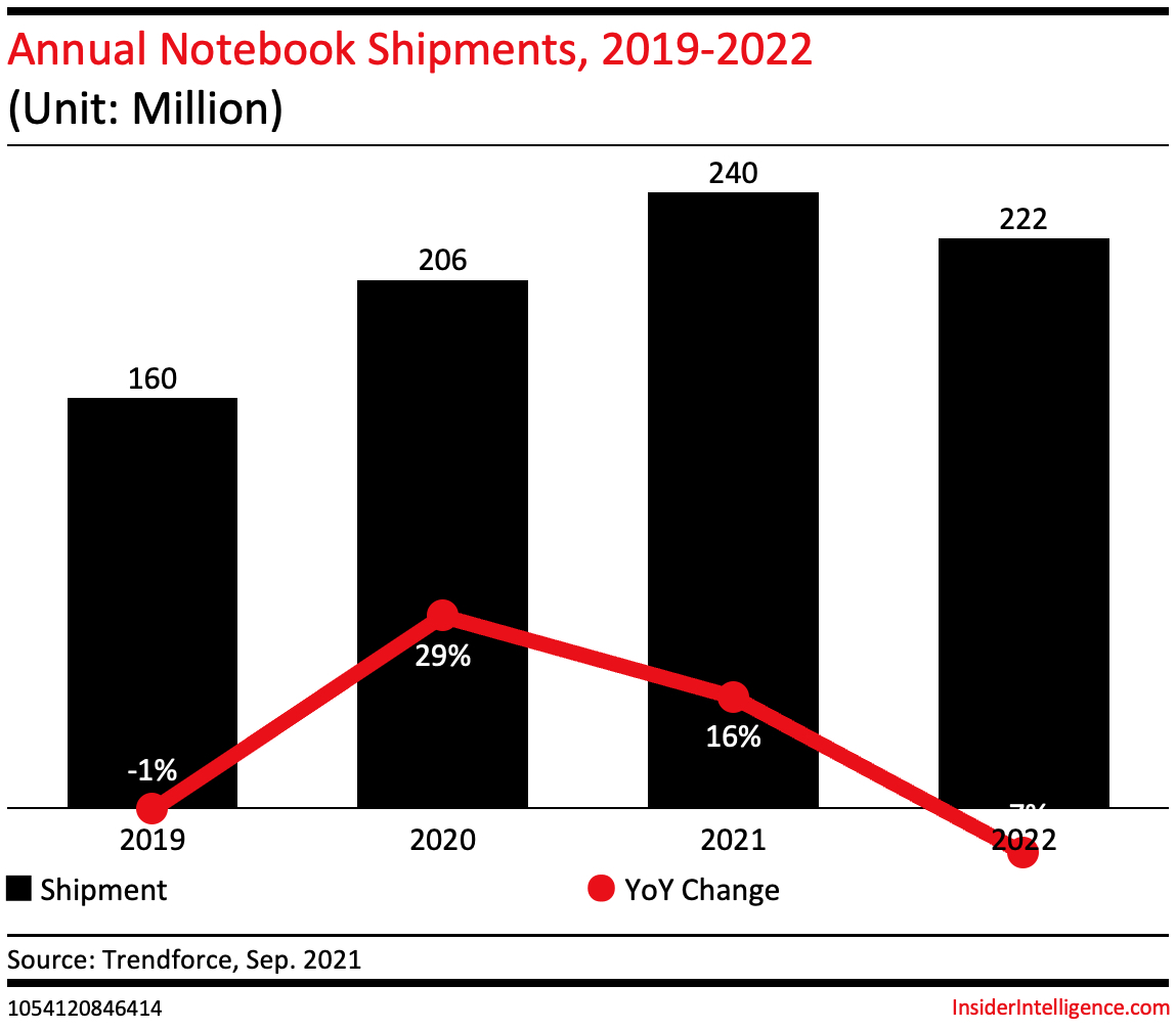 - Trendforce still expects 36 million Chromebook unit sales for 2021 in light of waning demand. Overall laptop shipments will see a 16.4% YoY increase or a total of 240 million unit sales.