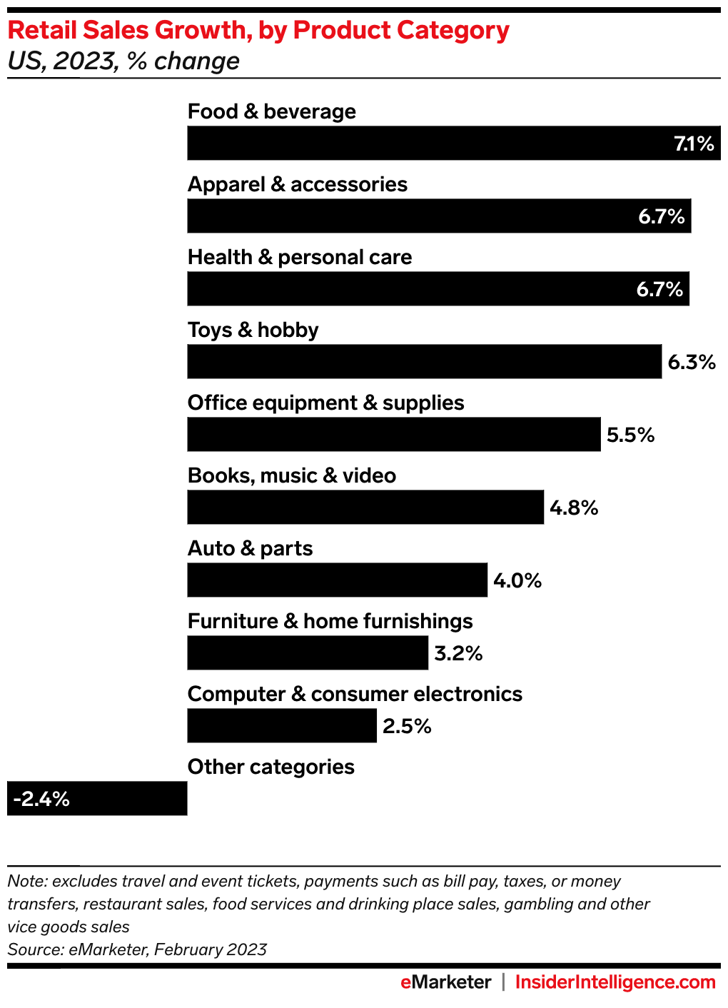 - Our US Total Retail Sales Forecast follows a similar trend line with total retail sales expected to grow 3.3%, down from 8.1% growth last year. YoY growth in several categories, including food and beverage (7.1%), apparel and accessories (6.7%), and health and personal care (6.7%), are expected to remain strong, due in part to inflation.
