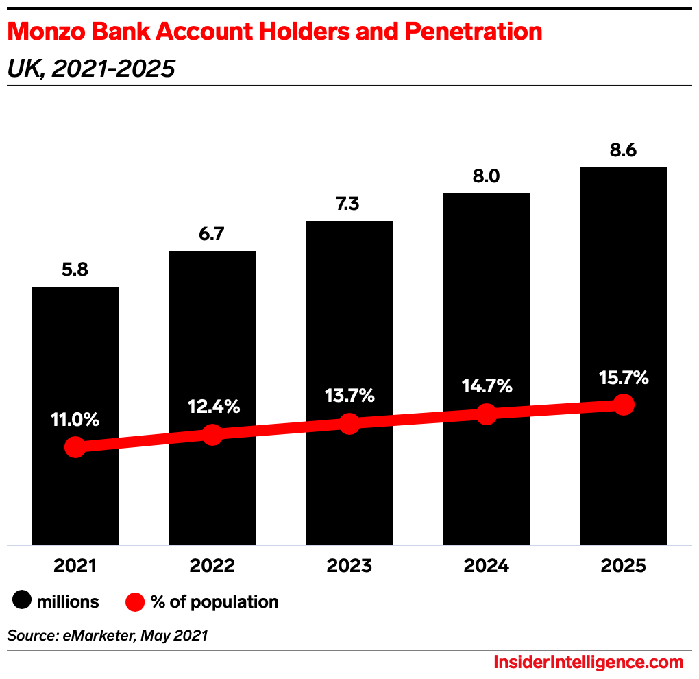 - On the plus side, Monzo reported that, as of March 2021, around 25% of its top line is backed by three paid products: Monzo Business, Monzo Plus, and Monzo Premium. The trio of subscription offerings brought in over 210,000 customers. For overall users, the neobank posted 23% YoY user growth, going from 4 million to 5 million. Monzo also pointed out that 92% of its user growth happened through word of mouth.