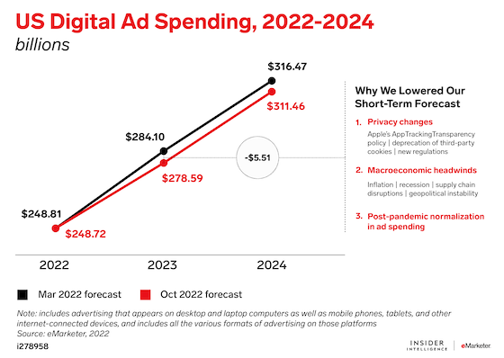 We cut $5.51 billion from our US digital ad spending forecast for 2023, due to the fallout from Apple’s privacy changes, Google’s deprecation of third-party cookies, and a stricter regulatory environment. Along with inflation and a potential recession, these challenges will depress spending until 2025, when it should return to previously projected levels.