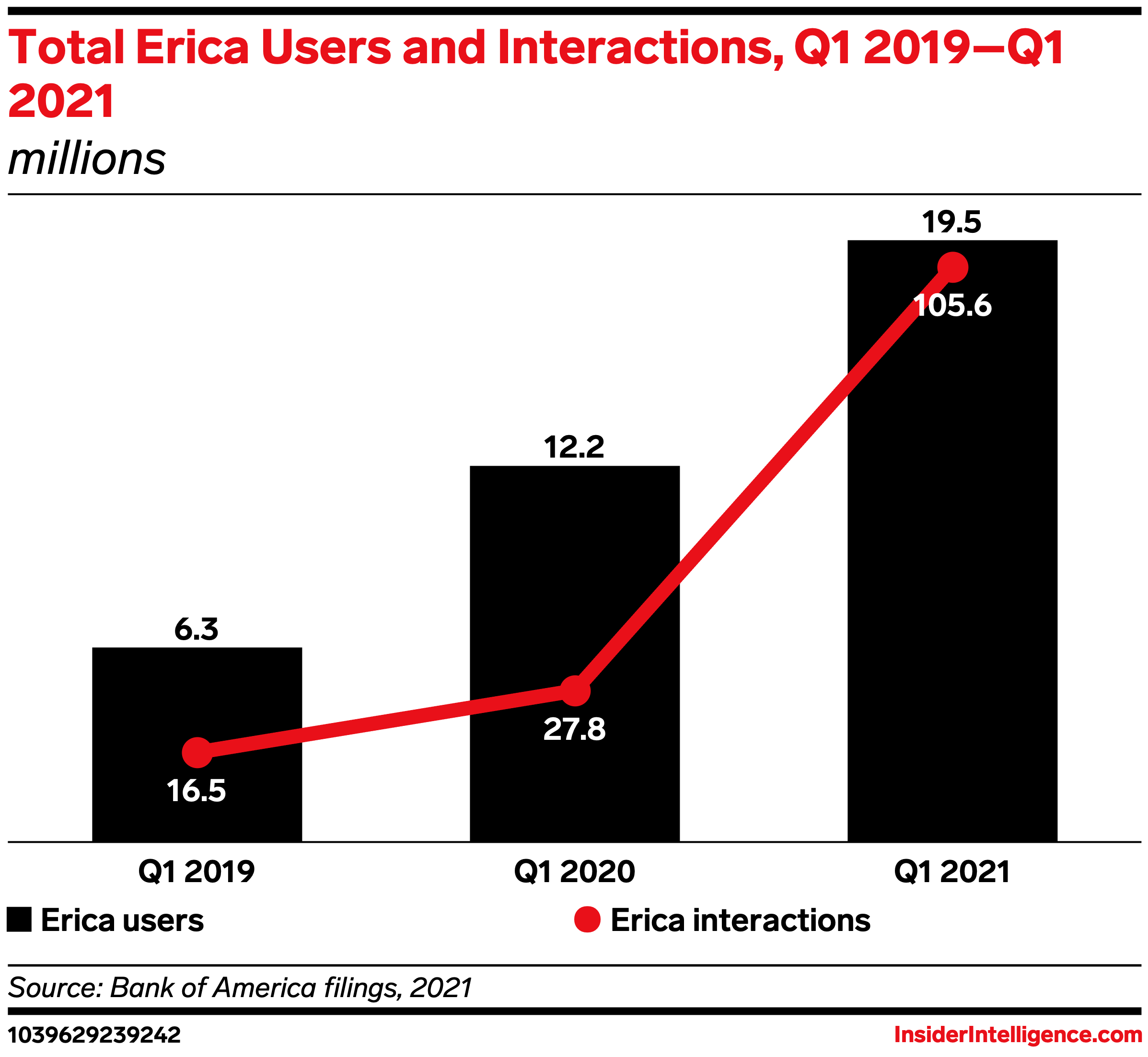 - Erica saw record growth over the last quarter. Between Q4 2020 and Q1 2021, the AI assistant gained over 2 million users, hitting 19.5 million. Over the same period, it saw a record 198% jump in total interactions with the service. During the early days of the crisis, the bank better equipped Erica to respond to pandemic-related inquiries, which precipitated a spike in users. It’s possible that BofA similarly ramped up Erica to more accurately field stimulus-related questions, potentially contributing to Q1’s noteworthy growth.