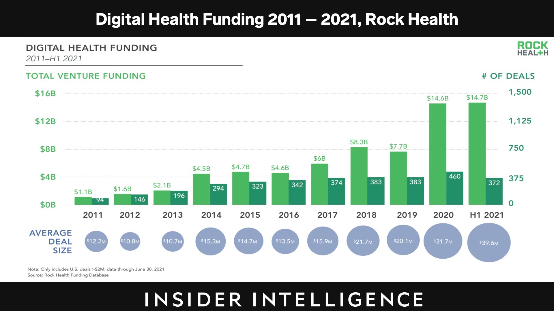 - In H1’21, there were 372 digital health deals with an average deal size of $39.6 million.