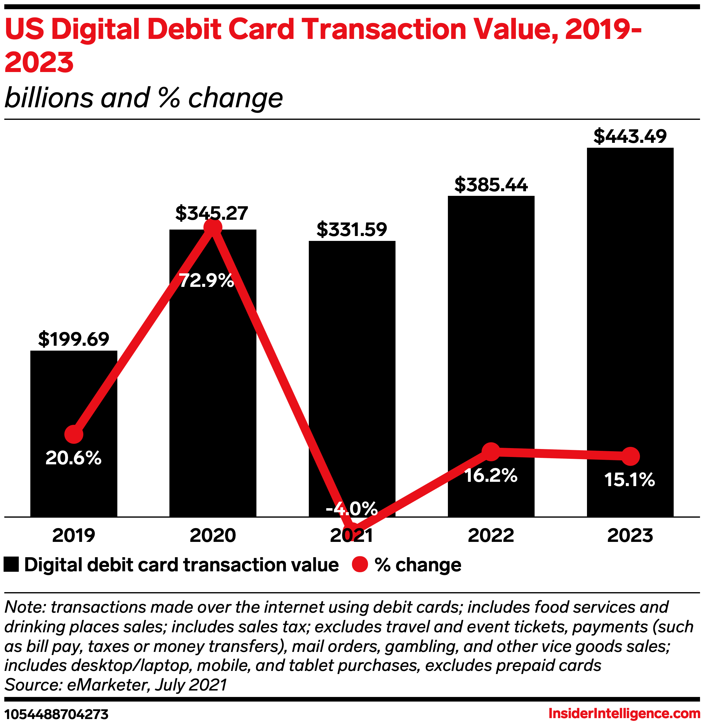Looking ahead: Just because they saw growth in 2020 doesn't mean digital debit cards are the payment method of the future. After growth dips this year, it will slowly return in 2022 and 2023, resulting in a digital debit card transaction value of $443.49 billion in 2023.