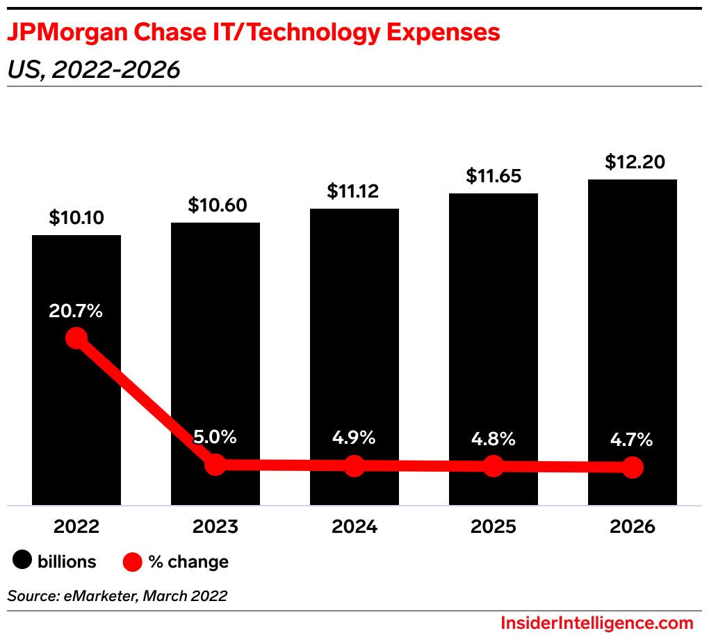 - He said JPMorgan will have almost $2 billion in “incremental expenses” this year related to tech—and he previously said it plans to spend as much as $12 billion in 2022. Our new forecast shows the bank allocating $10.10 billion for this year, excluding salaries.