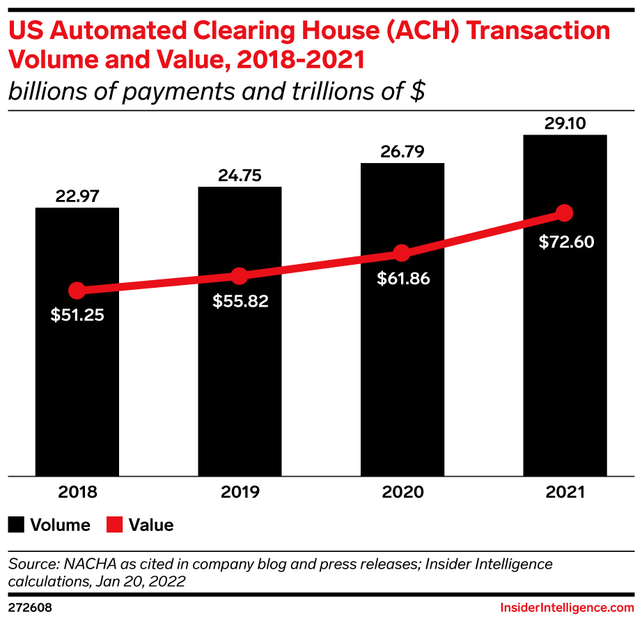 Discover may be using the integration to improve its positioning as a payment provider: Increased use of the ACH network, which typically powers A2A transactions, for B2B payments and healthcare transactions is set to open a pathway to use it for retail payments. ACH volume grew 8.7% year over year in 2021.