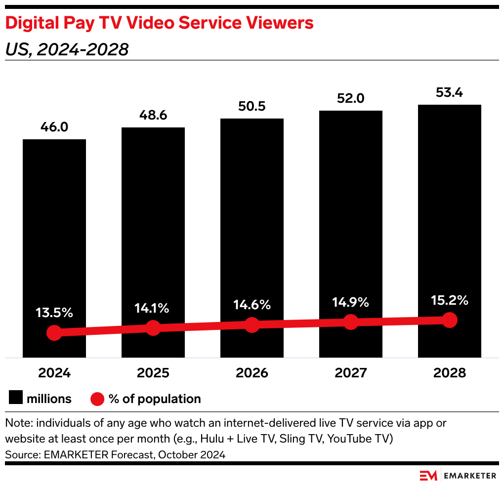 - We expect US digital pay TV households to steadily increase over the next few years, from 20.3 million in 2025 to 22.2 million in 2028. YouTube TV has the largest share of viewers at 23.3 million, with Hulu + Live TV in second at 11.6 million.