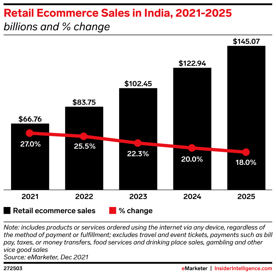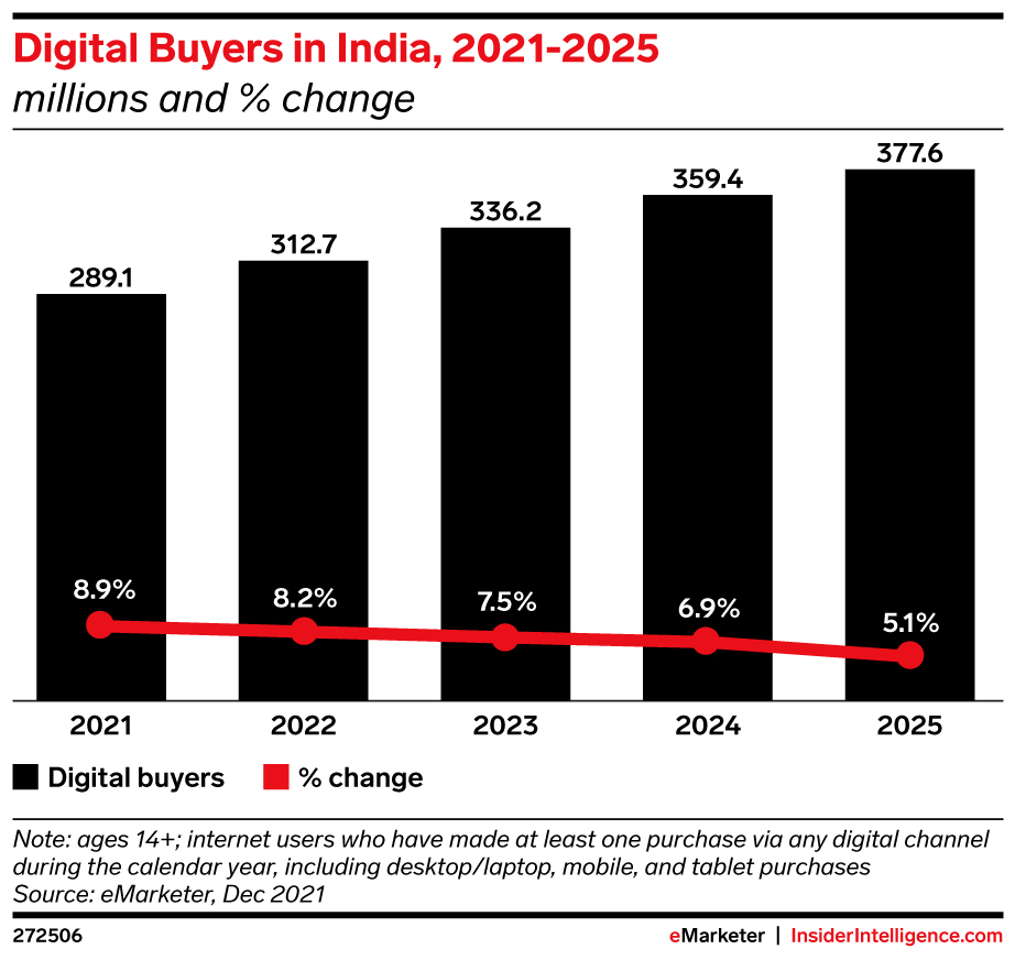 There will be 312.7 million digital buyers in India this year, up 47 million from 2020. Between 2022 and 2025, the country is expected to add close to 65 million more digital buyers.