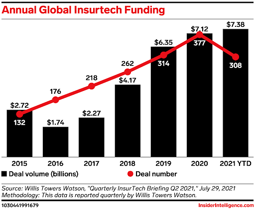 - The US market value of embedded insurance is expected to grow from $5 billion in 2020 to $70.7 billion in 2025, per Lightyear Capital.
