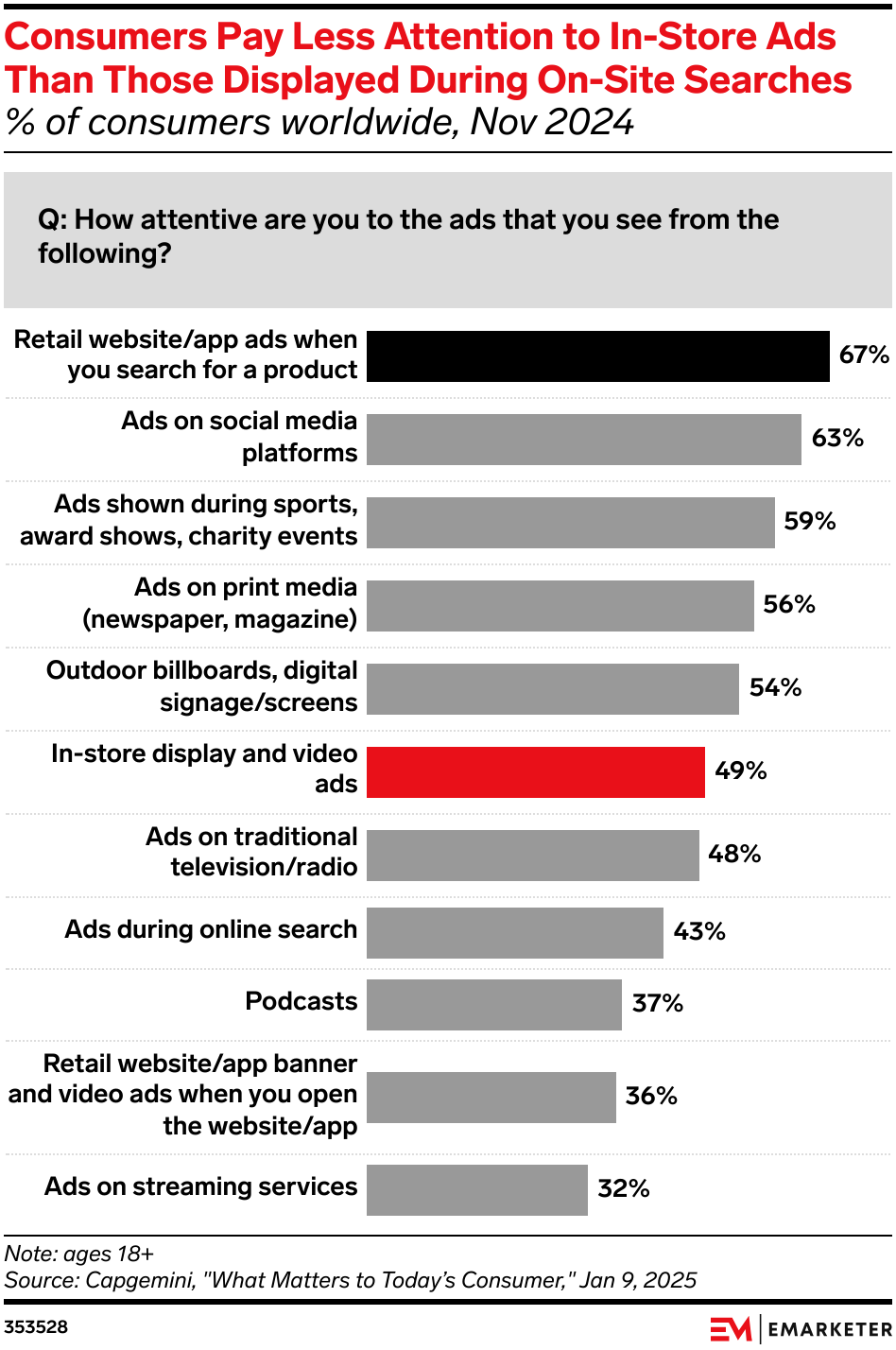 Key Stat: Less than half (49%) of consumers worldwide say they pay attention to in-store display and video ads, creating a key challenge for retail media networks (RMNs).