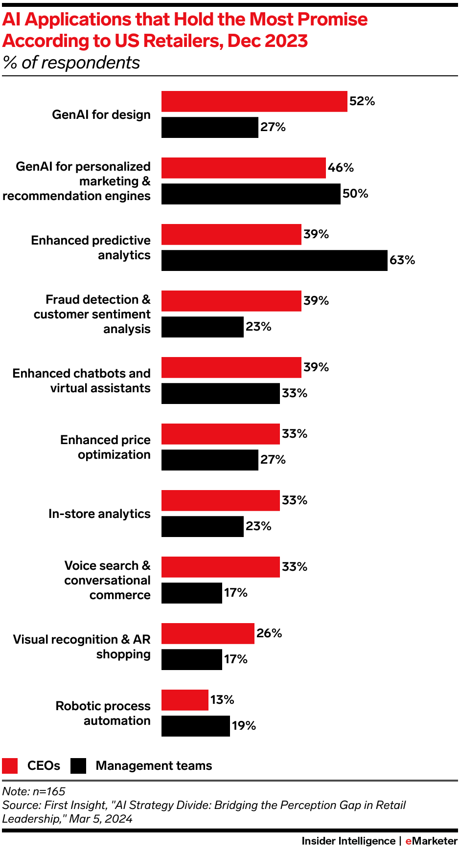 The big takeaway: It’s clear that AI—and genAI in particular—is at the top of retailers’ to-do lists in 2024. But companies are rightly concerned about moving too quickly, given repeated controversies involving genAI as well as yet-unresolved issues regarding data privacy and hallucinations.