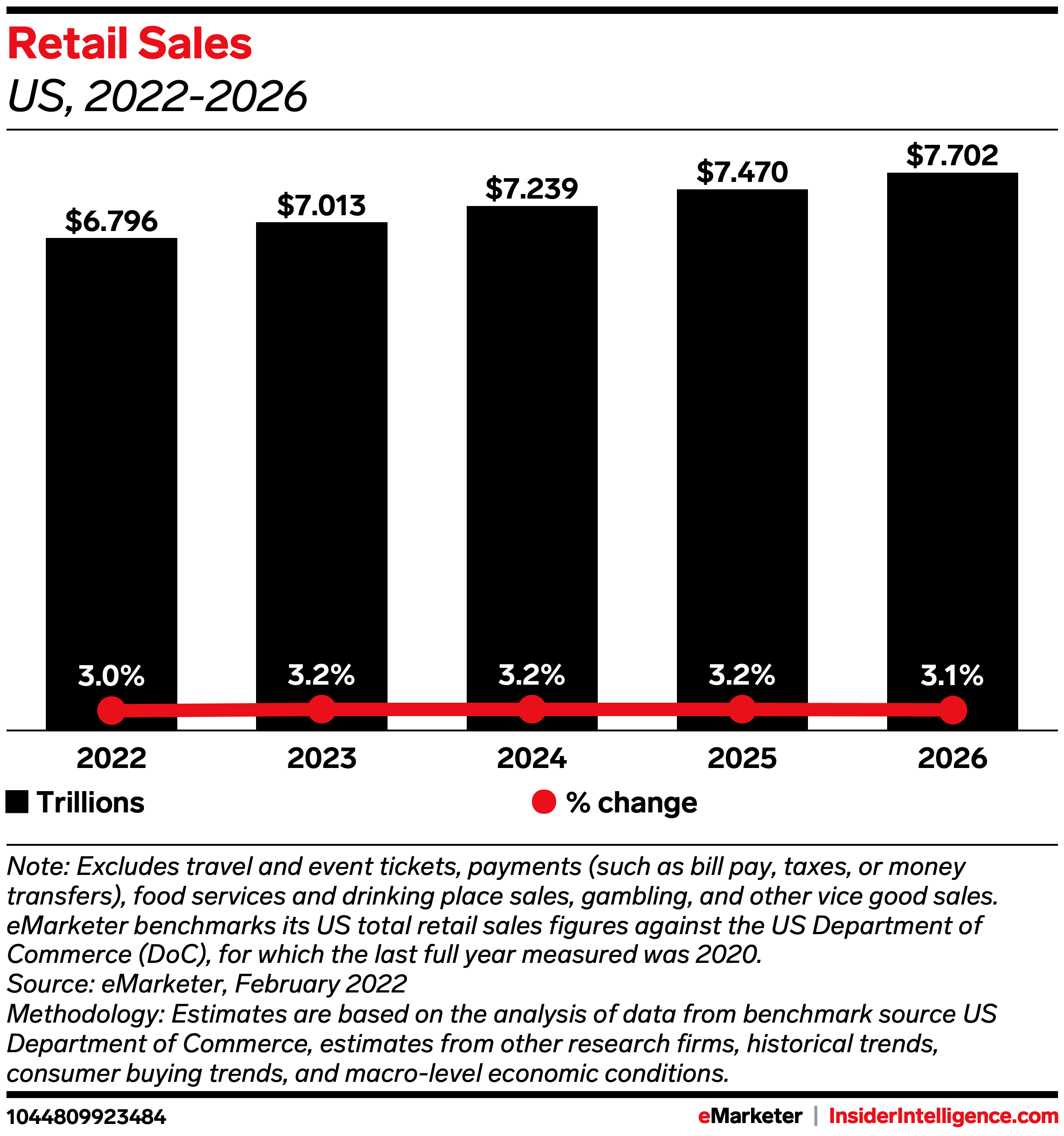 - Retail sales have steadily increased each month—January sales jumped the most since March 2021. And total US retail sales are expected to climb up 3% year over year (YoY) and hit $6.796 trillion in 2022, per eMarketer forecasts from Insider Intelligence. As strong retail appetite and widespread inflation come to a head, consumers may be more inclined to spend with private-label cards to earn rewards on purchases at their favorite stores.
