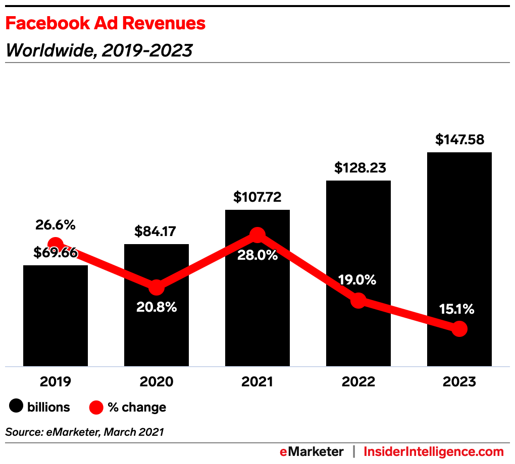The big picture: Facebook (including Instagram) is on track to surpass $100 billion in net worldwide ad revenues for the first time, with $107.72 billion in 2021. That will give it 23.7% of the worldwide digital ad market. Google is No. 1 with a 28.6% share.