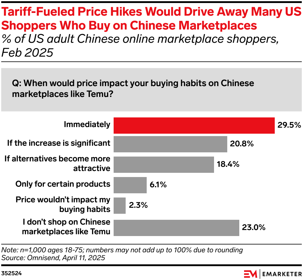 Key Stat: Nearly 30% of US consumers would immediately stop shopping or shop less on China-based ecommerce marketplaces if tariffs raise prices, per a February 2025 Omnisend survey.