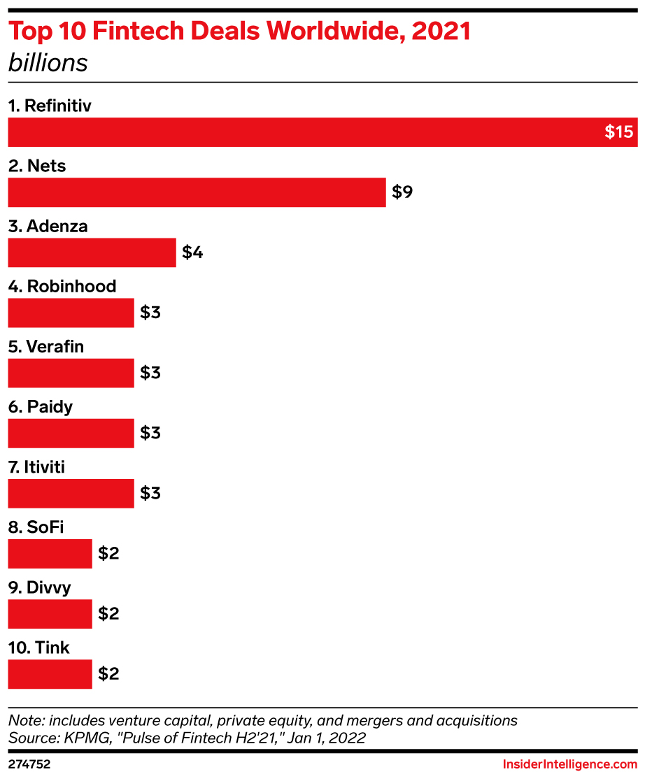 Fintech defies downturn: The total global M&A market fell by 20% YoY to $2 trillion in the first half of 2022, per PwC. But fintechs have bucked the trend, driven by firms looking to snap up struggling startups at a discount.