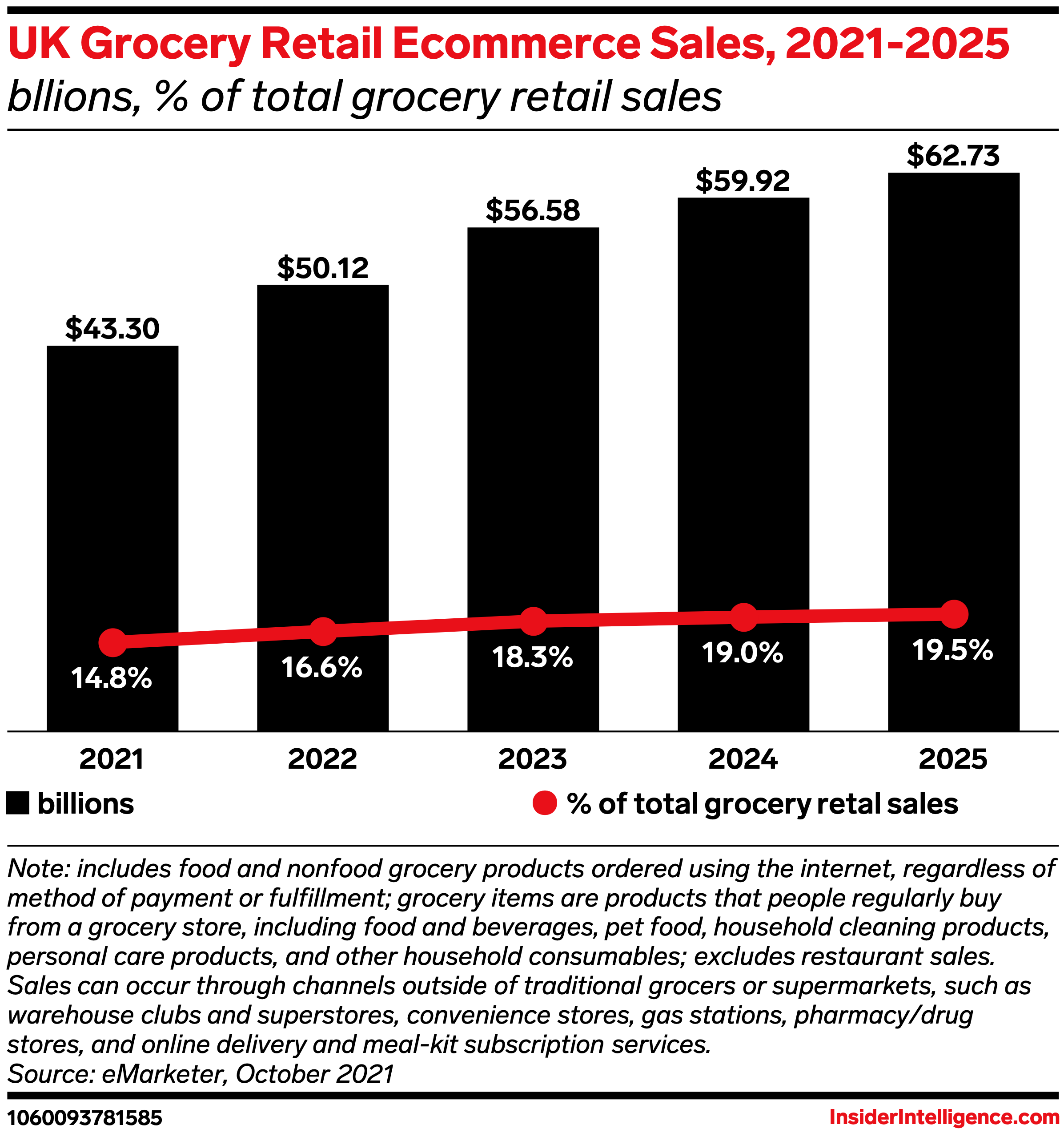 Grocery ecommerce sales will represent 19.5% of total grocery sales and 21.6% of total ecommerce sales by 2025.