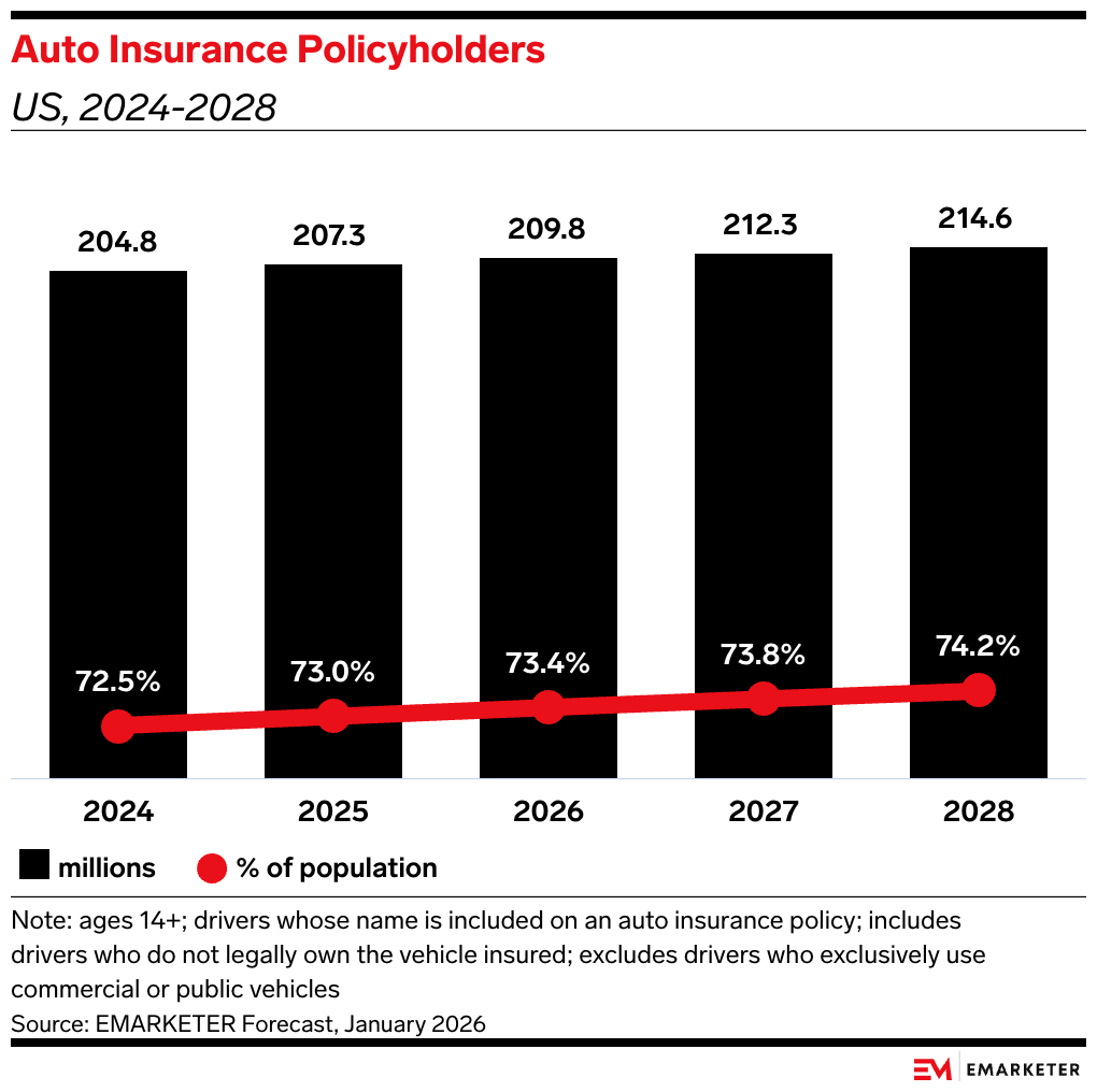 The data: Auto insurance will remain a stable market, according to our recent forecast. US auto insurance policyholders will total 214.6 million by 2028, a modest 3.5% increase from 2025.
