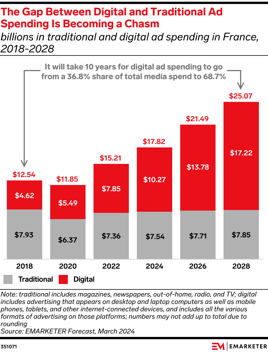 Key Stat: Digital advertising became the majority share in 2022 for the first time. By 2028, it will have stretched this lead considerably and account for 68.7% of total media spending.