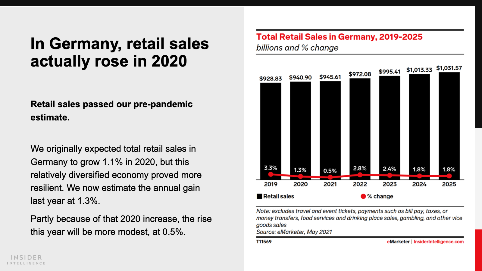 Pre-pandemic, we predicted that total retail sales in France would rise 1.4% in 2020; instead, they shrank by 4.6%. In Germany, retail suffered much less. We originally expected retail sales there to grow 1.1% in 2020 but now estimate the gain at 1.3%. This year, total retail sales are expected to rebound in France, with 3.8% growth. In Germany, the rise will be more modest, at 0.5%.