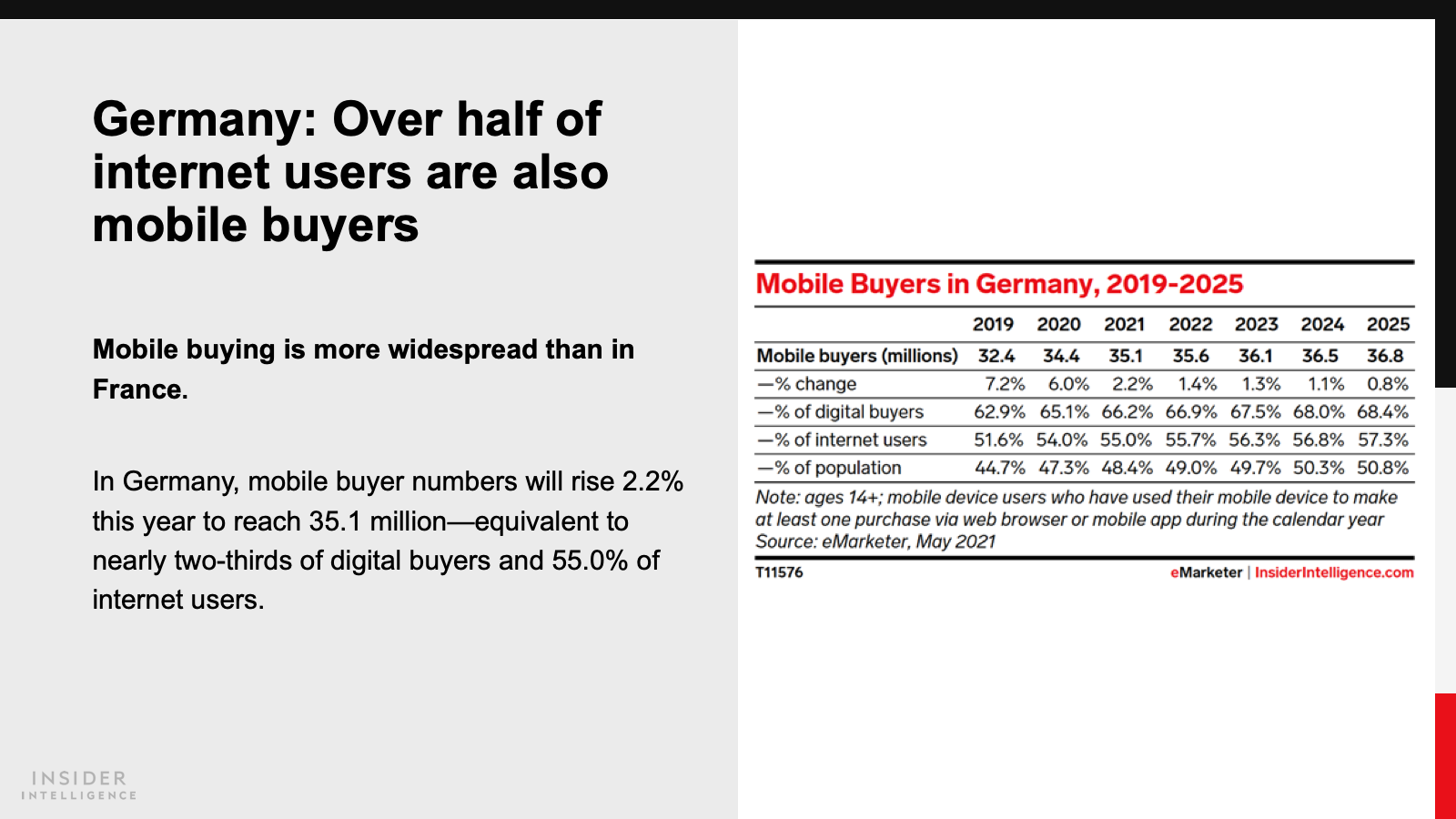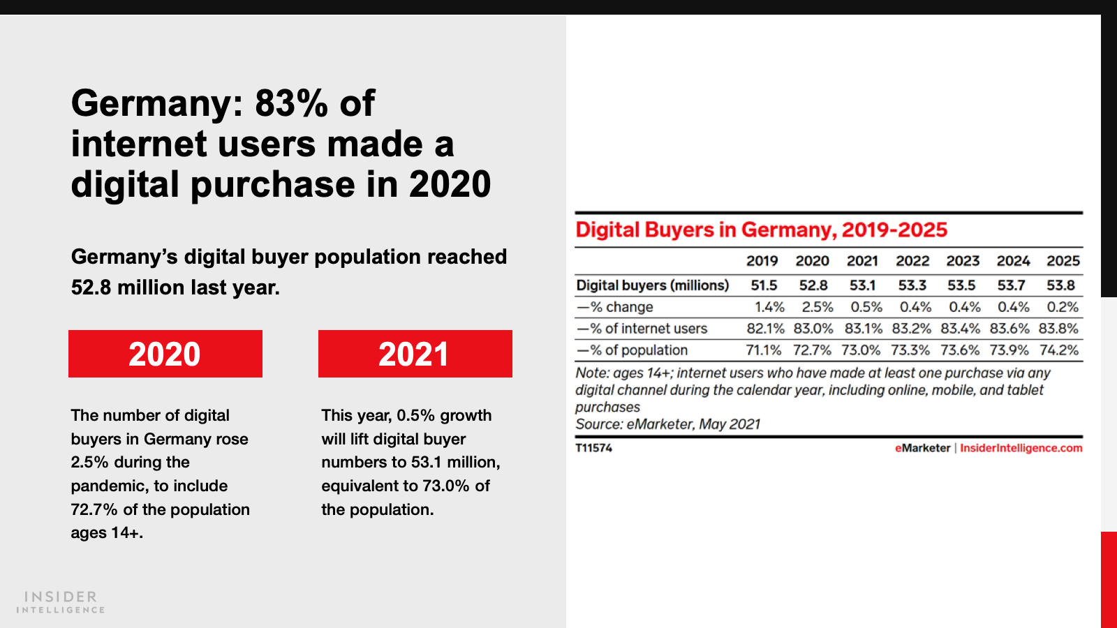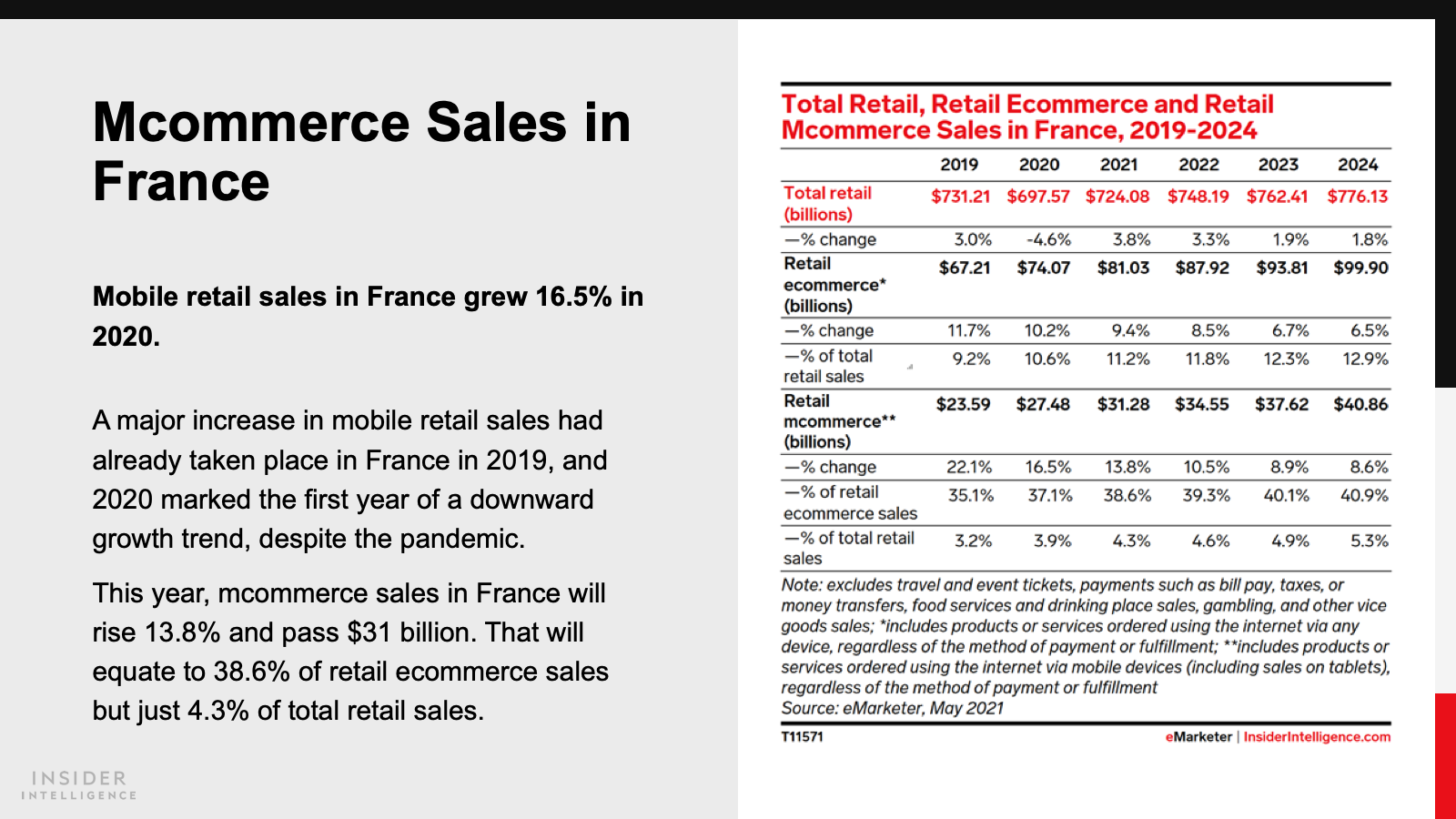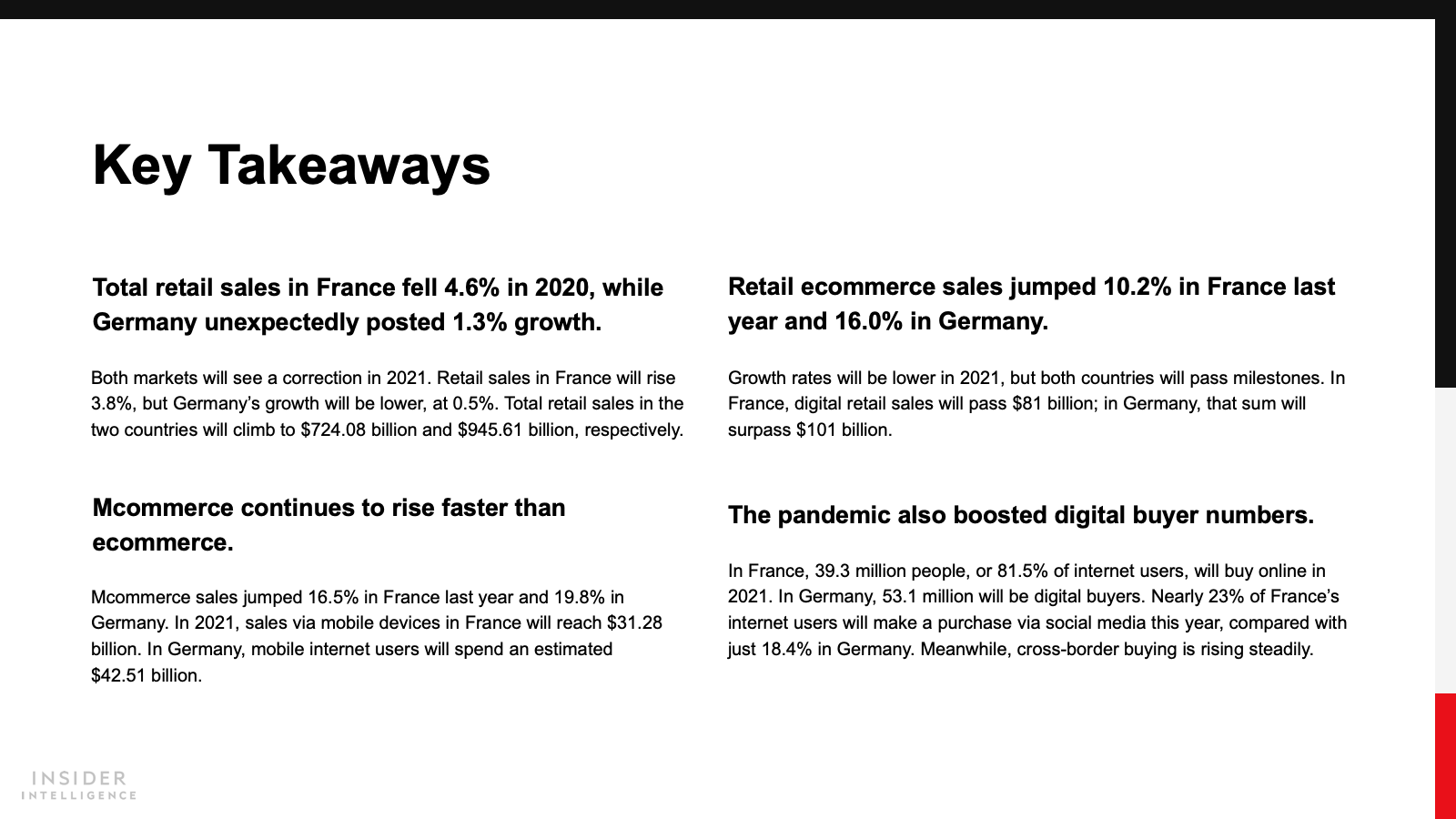 WHAT’S IN THIS REPORT? This report highlights our latest forecasts for retail, retail ecommerce, mcommerce sales, and digital buyers in France and Germany. It also looks at the pandemic’s impacts on retail ecommerce in 2020 and 2021.