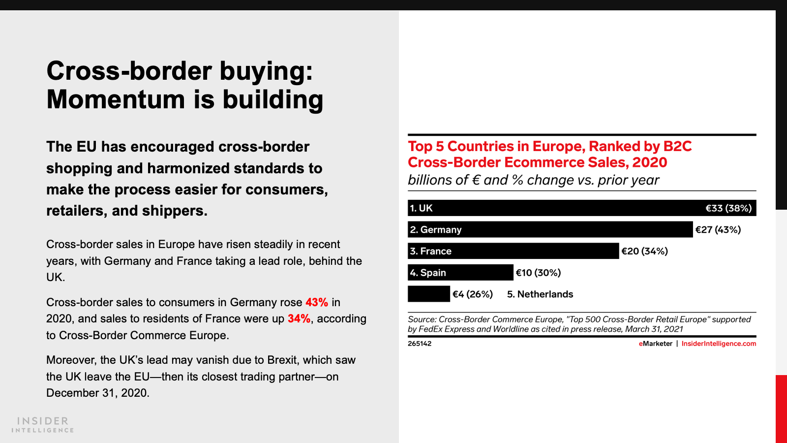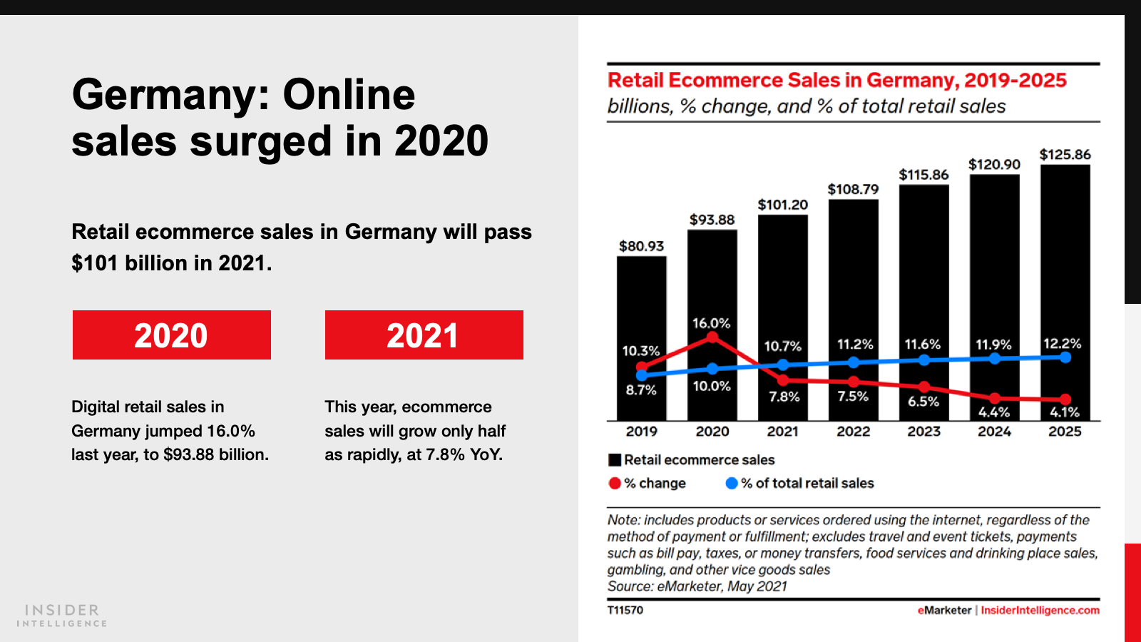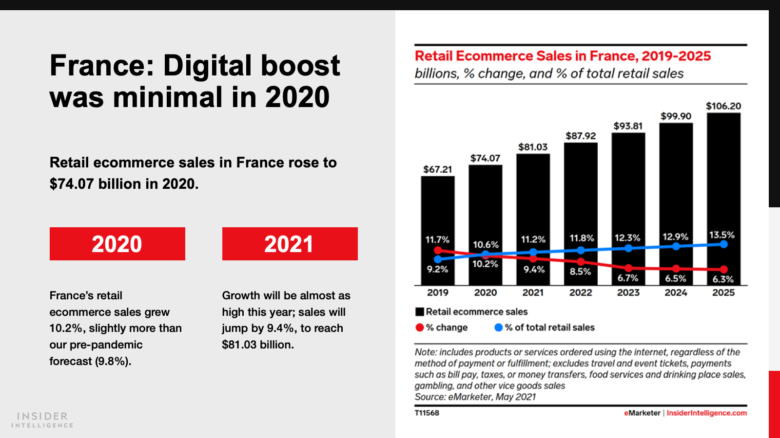 Both countries will pass milestones in 2021, as sales reach $81.03 billion (€71.06 billion) in France and $101.20 billion (€88.75 billion) in Germany. Annual growth rates will decline to single digits this year, as some retail trade returns to physical stores.