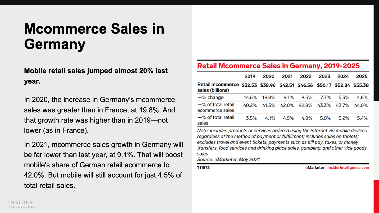 Retail mcommerce sales continue to rise faster than ecommerce sales overall. We anticipate 13.8% year-over-year (YoY) growth in mobile sales in France in 2021, lifting sales to $31.28 billion (€27.43 billion). In Germany, a 9.1% YoY increase will boost mcommerce sales to $42.51 billion (€37.28 billion).