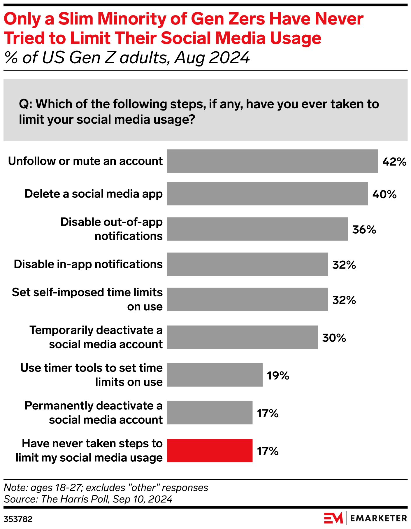 Key Stat: Only 17% of Gen Zers have never tried to limit their social media usage, per The Harris Poll, a sign that this generation is hyperaware of their screentime and the negative effects of social media despite being avid users.
