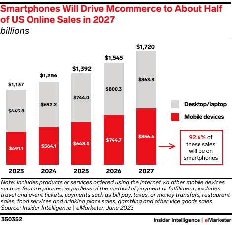Smartphones will continue to gain ground as digital sales shift away from computers and tablets. In 2027, mcommerce (sales made on smartphones, tablets, and other mobile devices) will near the tipping point of half of ecommerce sales.