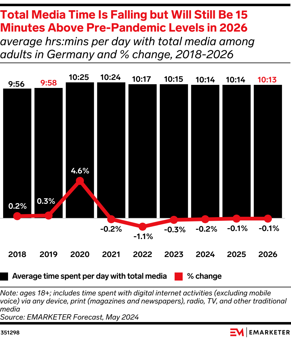 Total media time is holding steady in Germany, thanks to traditional media’s dominance and growing digital usage. The balance won’t tip toward digital within our forecast horizon, but this shift is inevitable.
