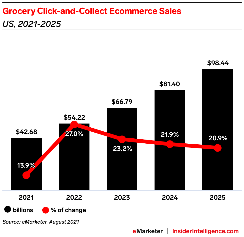 Grocery click-and-collect sales are growing quickly. We expect them to rise 27.0% in the US this year.