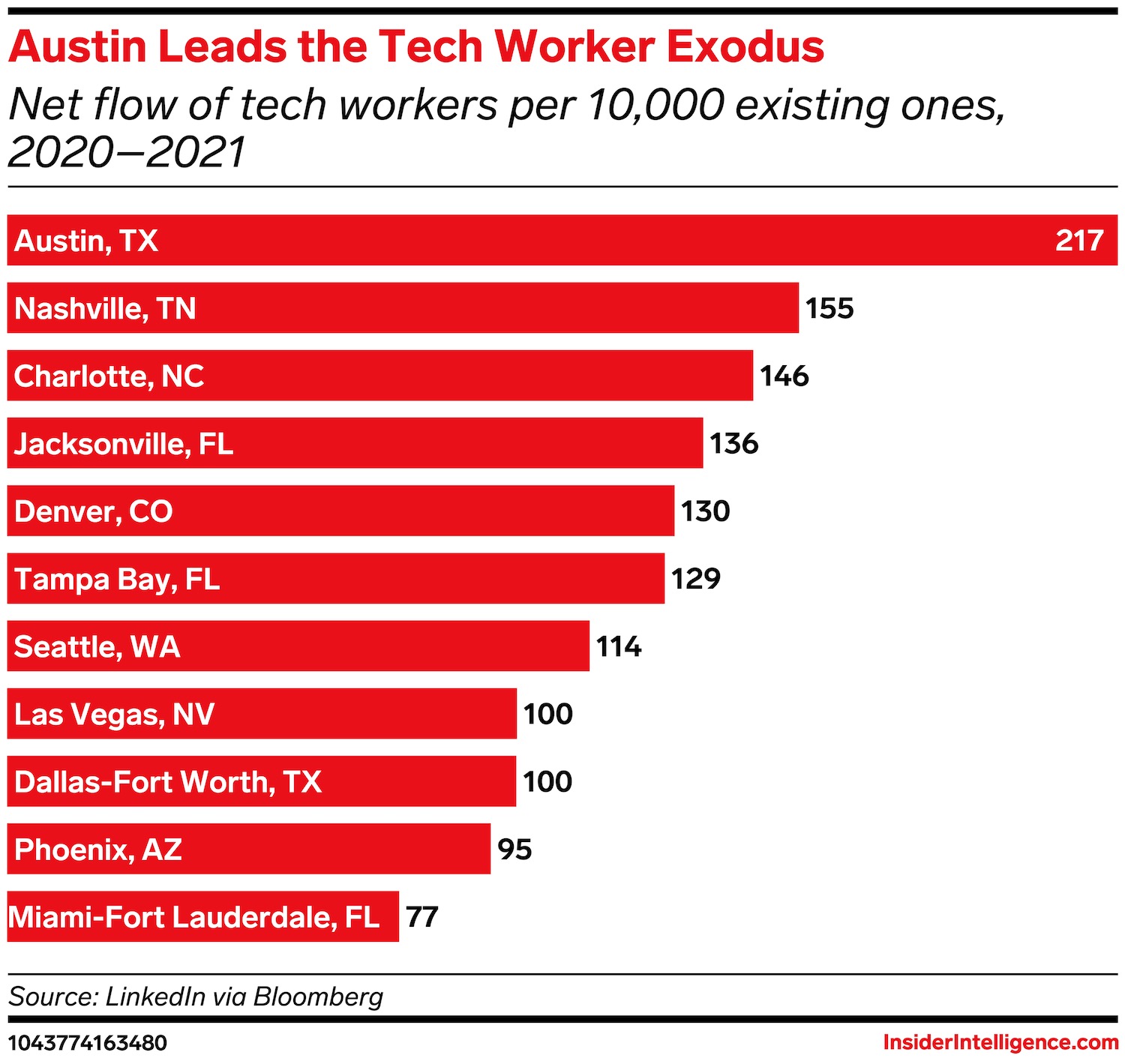 - The tech industry saw an exodus of workers moving away from traditional industry hubs during the pandemic, but there are signs many are returning as offices prepare for full-scale openings.