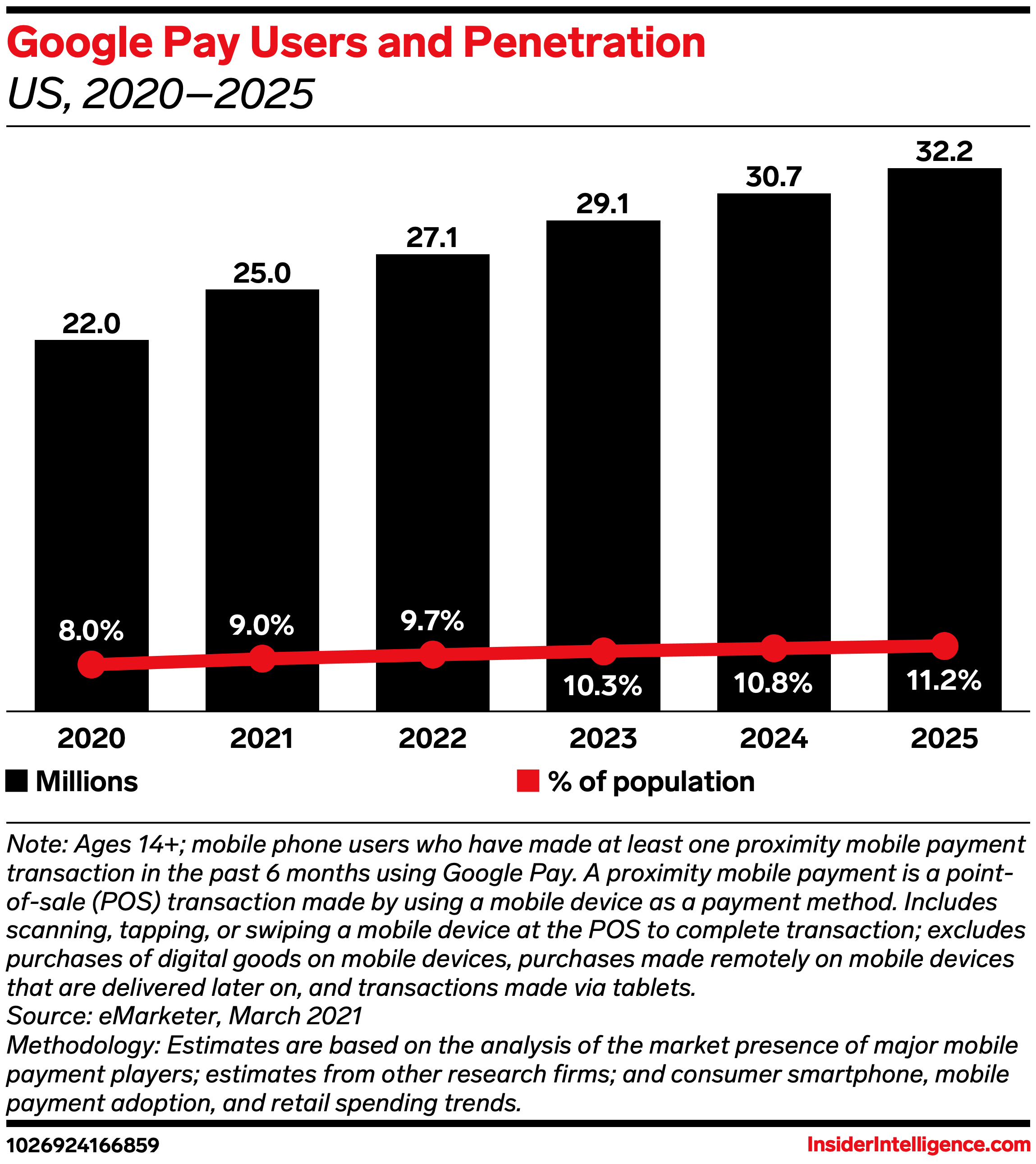 - Letting users store things like etickets and other digital documents broadens Google Pay’s use cases, which could help bring more customers to the app. Last year, Google Pay had an estimated 25 million users in the US, per Insider Intelligence forecasts.