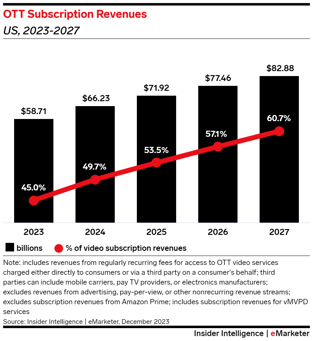 Key stat: OTT will account for more than half (53.5%) of US video subscription revenues by 2025, when it will reach $71.92 billion, according to our December 2023 forecast.