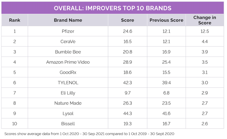 It’s no surprise, then, that the most improved brand in the eyes of consumers this year is Pfizer, one of the leading COVID-19 vaccine manufacturers. The pharmaceutical brand was central to the vaccine effort in 2021 and registered a change in score of a whopping +12.5 points—nearly three times that of the next best improver.