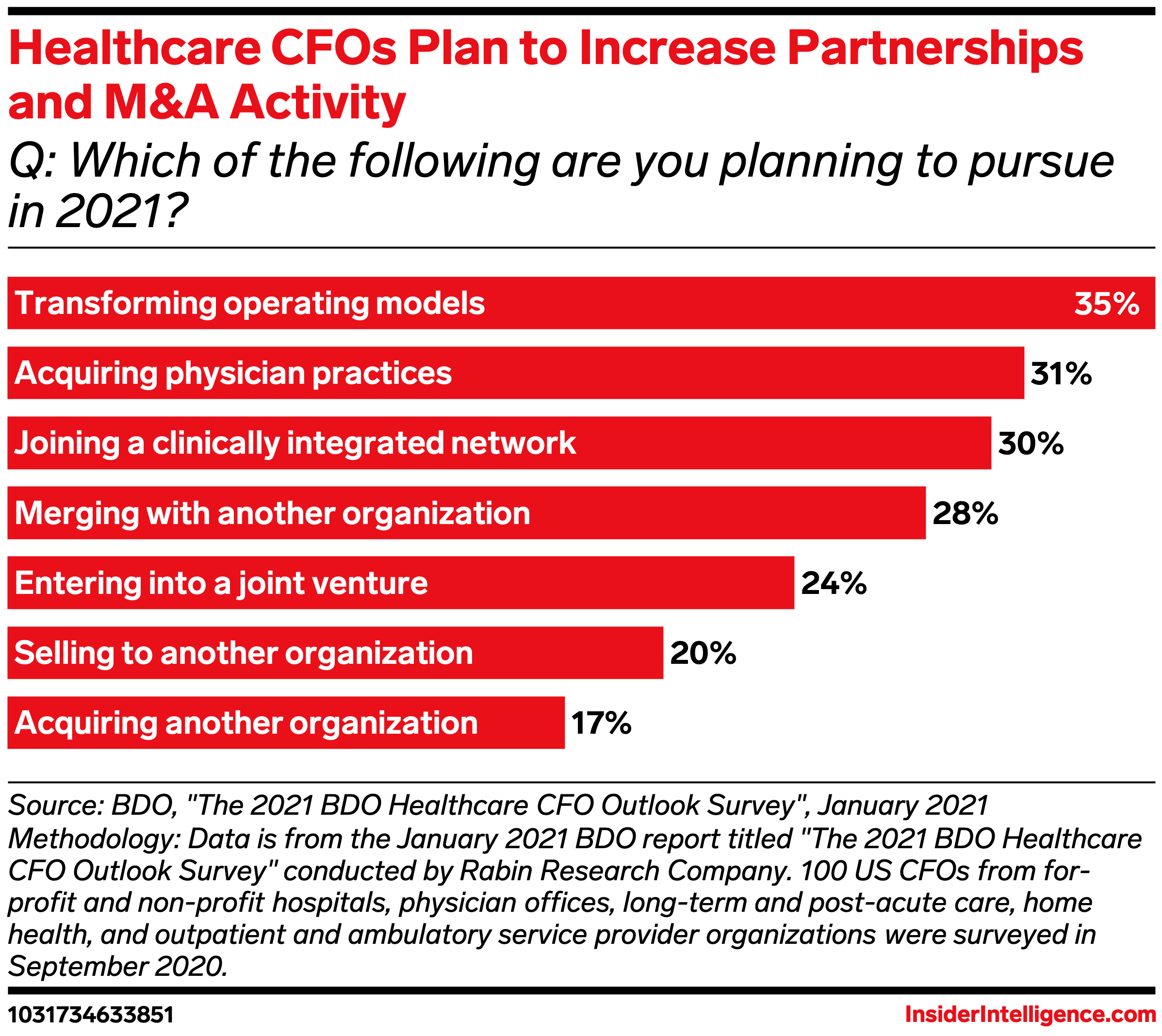 - Healthcare CFOs think the pandemic is a catalyst for more M&A activity down the road: 28% plan to pursue healthcare mergers, and 18% plan to pursue acquisitions, according to BDO’s 2021 Healthcare CFO Outlook survey.