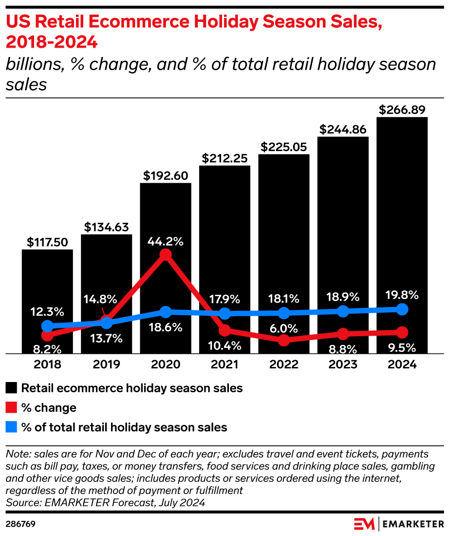 Holiday ecommerce penetration will reach a new peak in 2024. Holiday retail ecommerce sales will account for 19.8% of total holiday retail sales. This represents holiday ecommerce’s largest jump in share since 2020.
