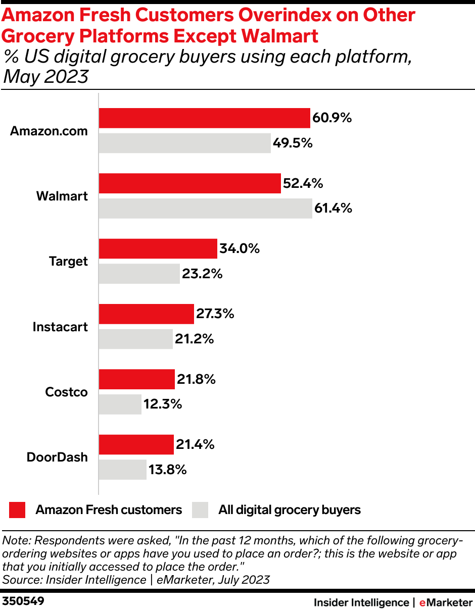 - Amazon Fresh has a smaller audience than the leading players, but it still sits within the top five. Its share of recent digital grocery buyers is similar to Instacart’s and larger than those of leading US grocery chains like Costco Wholesale and The Kroger Co.