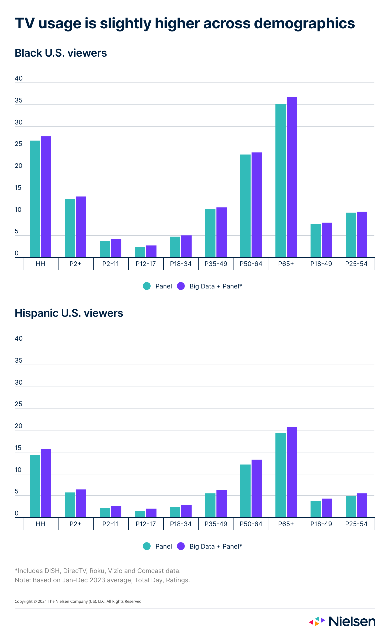 At Nielsen, we have invested a decade-worth of research in integrating big data sets into our methodologies in innovative ways that also ensure continuity with our currency measurement. For the 2024–2025 TV season in the US, we have enhanced our Big Data + Panel stream to include Comcast data, in addition to DISH, DirecTV, Roku, and Vizio.