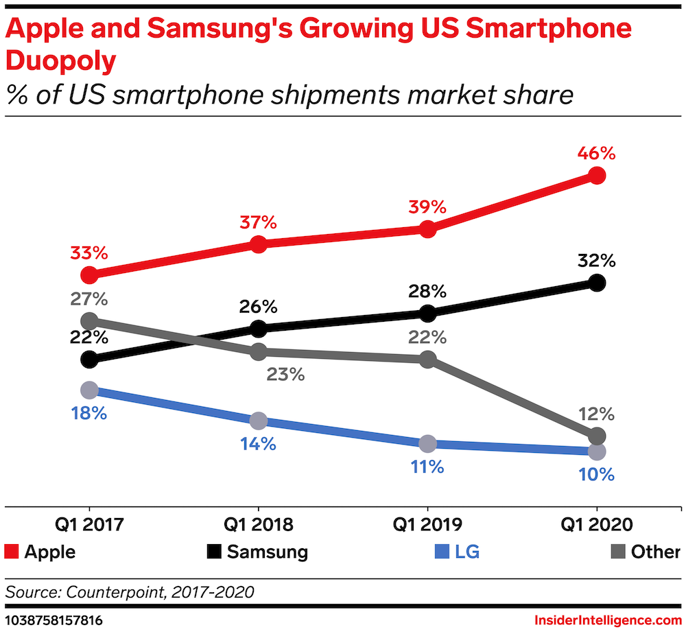 LG’s smartphone exit will create a near duopoly in the US between Apple and Samsung. In Q1 2017, LG made up 18% of total US smartphone shipments, making it the third-largest smartphone manufacturer by shipment market share, just behind Samsung (22%), according to Counterpoint data. By Q1 2018, LG’s market share had diminished to 14% before fading to 11% the next year. Globally, the story’s even worse. Once a significant worldwide player, LG dropped out of the top five of global smartphone share in 2015. Last year, LG made up just 2% of smartphone shipments worldwide, per Counterpoint.