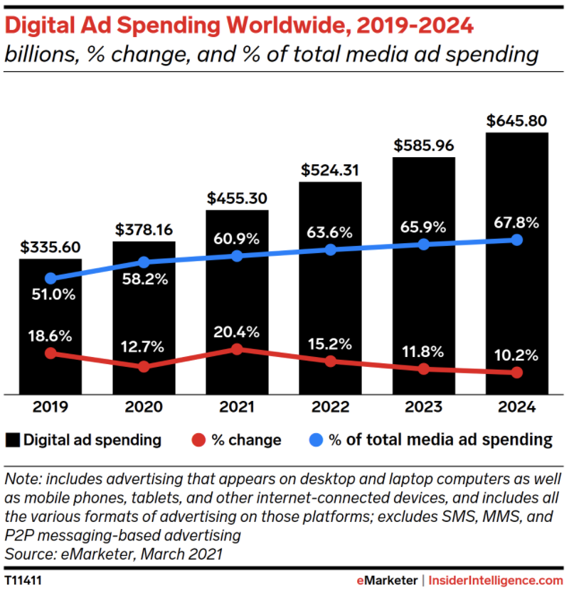 For digital, the story was the opposite. Worldwide digital ad spending nearly matched our pre-pandemic forecast for 2020, despite historic economic disruptions. In February 2020, we forecast 13.6% growth for digital ad spending worldwide. The final figure was a very close 12.7%.