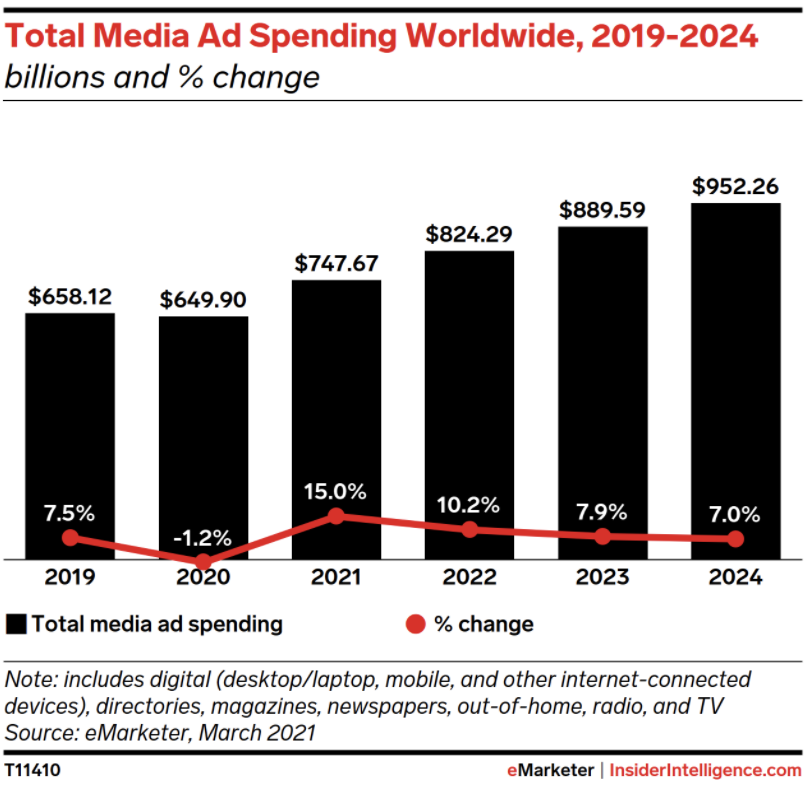 - Due to 2020’s abnormal dip, we forecast that total media ad spending will boom in 2021, as increasingly stable socioeconomic conditions lead to a catch-up growth rate of 15.0%. For digital ad spending, this figure will reach 20.4%.