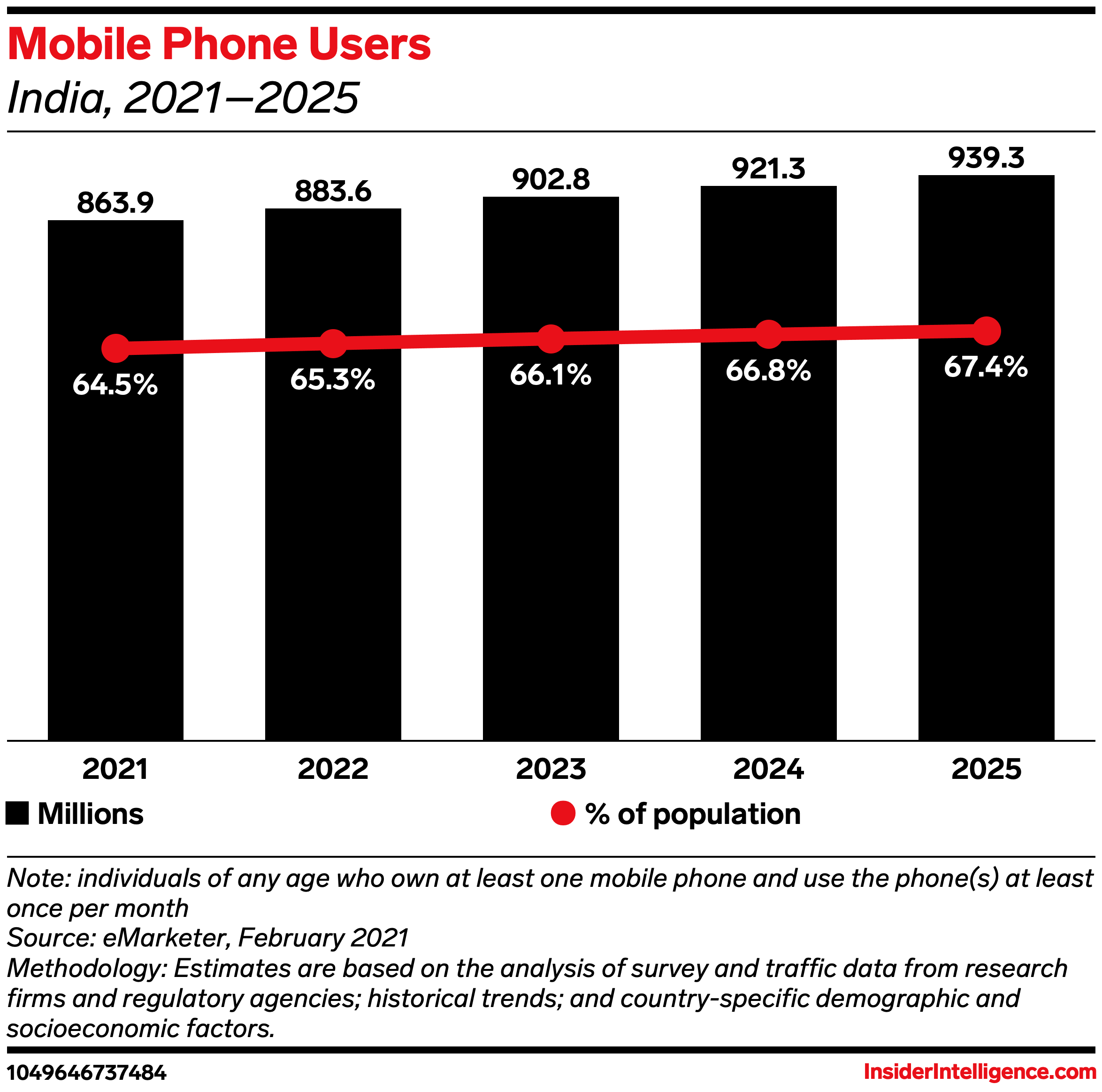 Why this can succeed: India’s high mobile phone penetration will likely support e-RUPI adoption among consumers—the number of mobile phone users in India is expected to hit 863.9 million this year, 64.5% of the country’s population, according to Insider Intelligence forecasts.