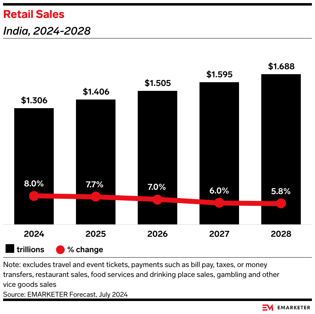 We’ve also revised our expectations for India’s retail sector. We expect retail and ecommerce sales growth of 8.0% this year, down from 9.5% forecast in June 2023.