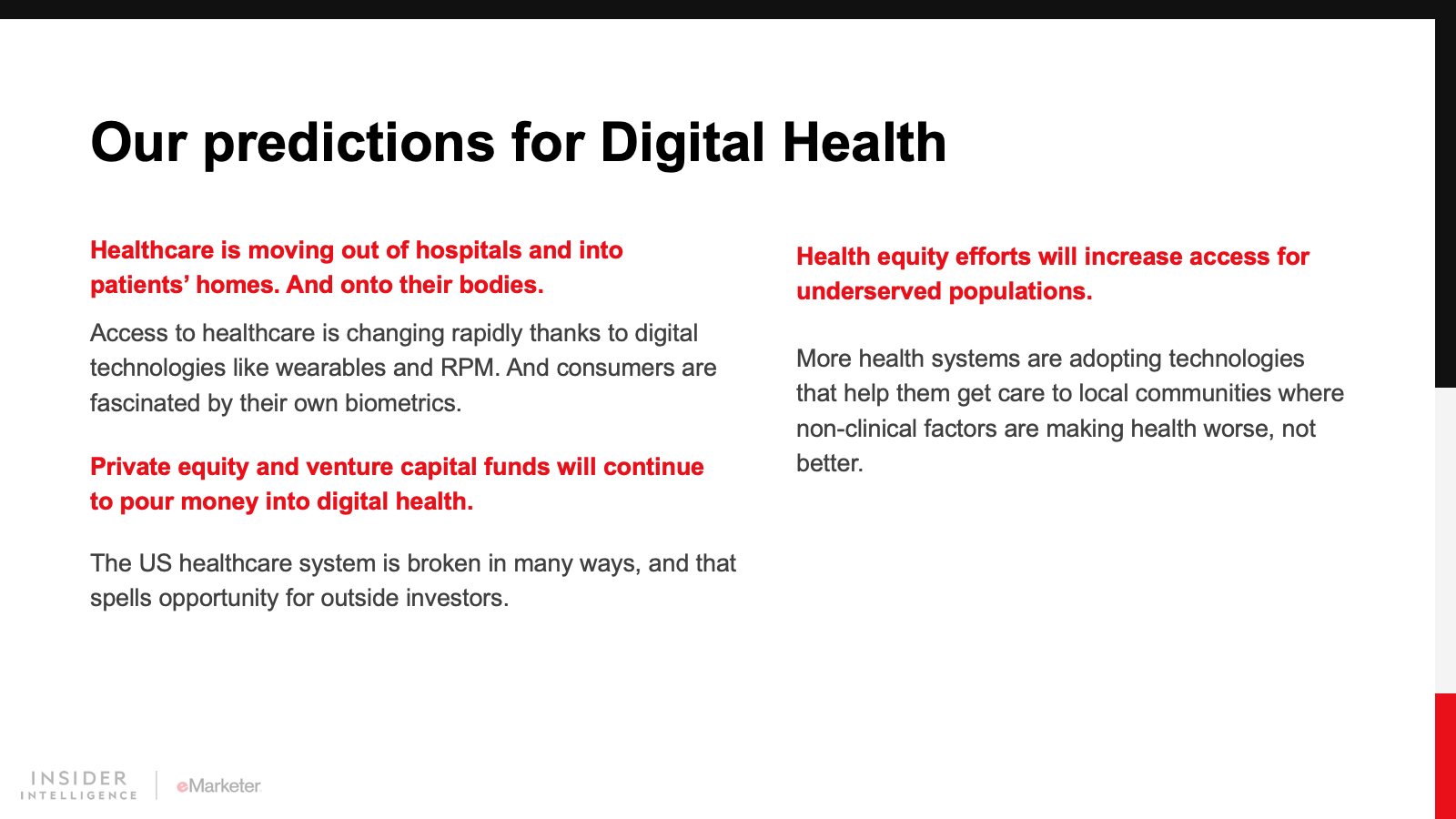 Investors and corporations are pouring billions of dollars into digital health companies with the goal of using solutions like telehealth, remote patient monitoring tools, and retail health clinics to reach consumers and deliver the care they need.