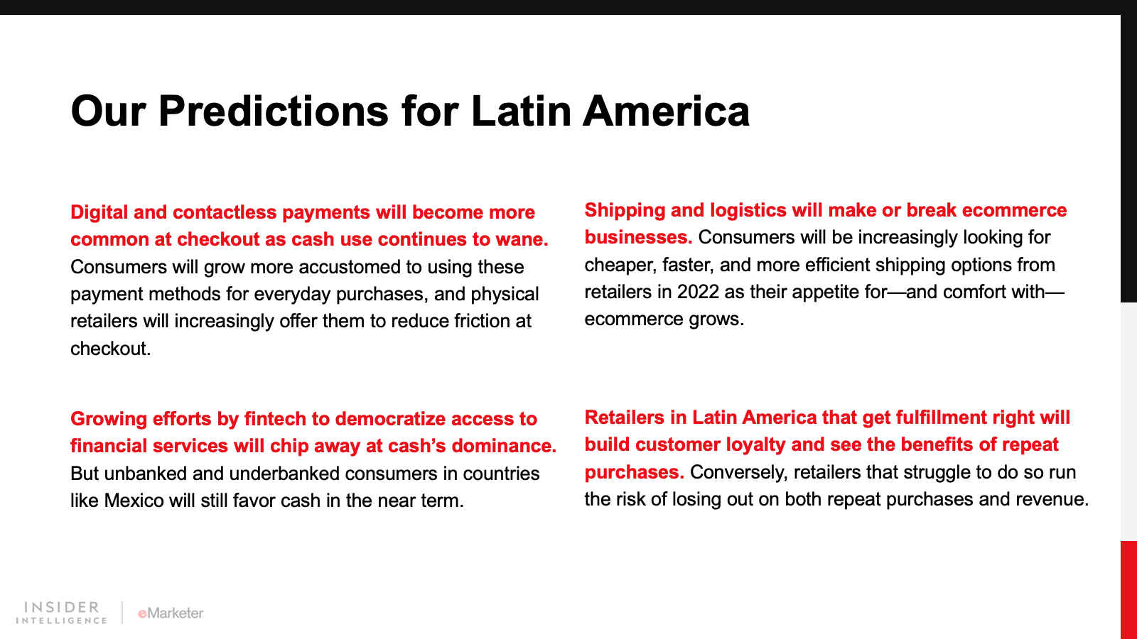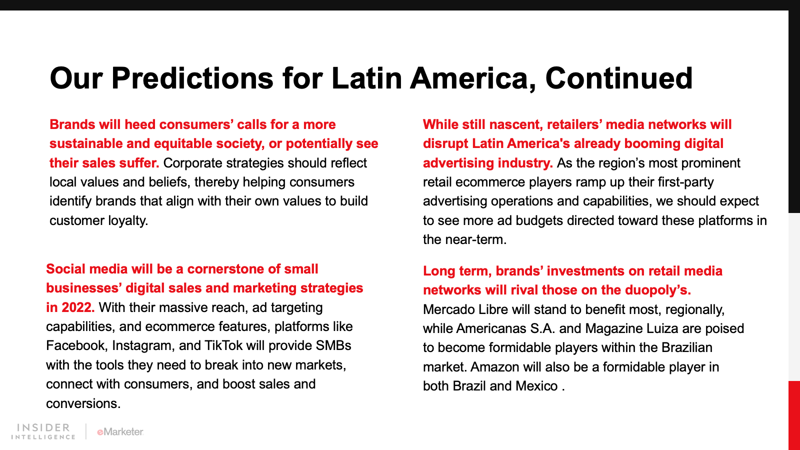 In Latin America in 2022, digital payments will make gains, consumer expectations around ecommerce will shift, corporate sustainability and social issues will come to the fore, SMBs will bank on social commerce, and retail media networks will make their presence felt.