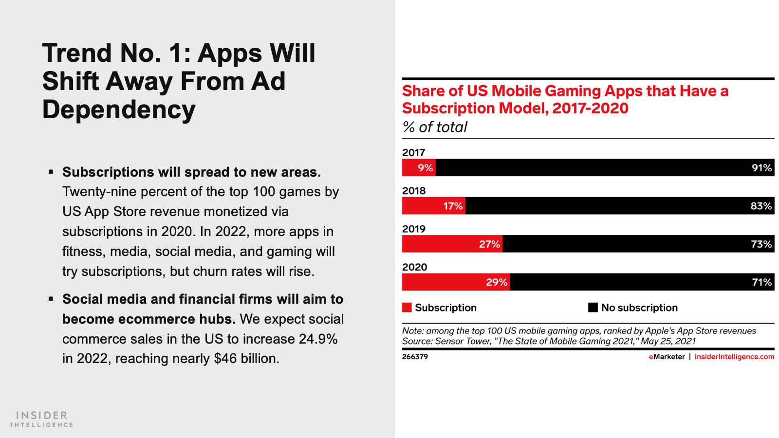 Adults in the US will spend nearly 4 hours, 30 minutes per day in 2022 on nonvoice activities on their phones and tablets—more than half the workday for many people. That figure is up 44 minutes per day since 2019. Despite a captive audience, app developers, retailers, and brands face new challenges to attract users and make money. Consumer expectations are shifting, and changes to Apple’s ad tracking policies make reaching target audiences more difficult than ever. Will new monetization strategies and retooled mobile user experiences be enough to let mobile players respond to a quickly changing mobile landscape?