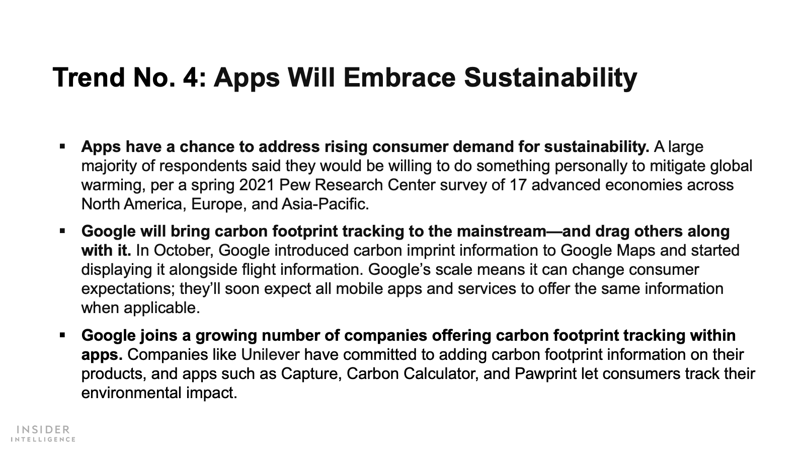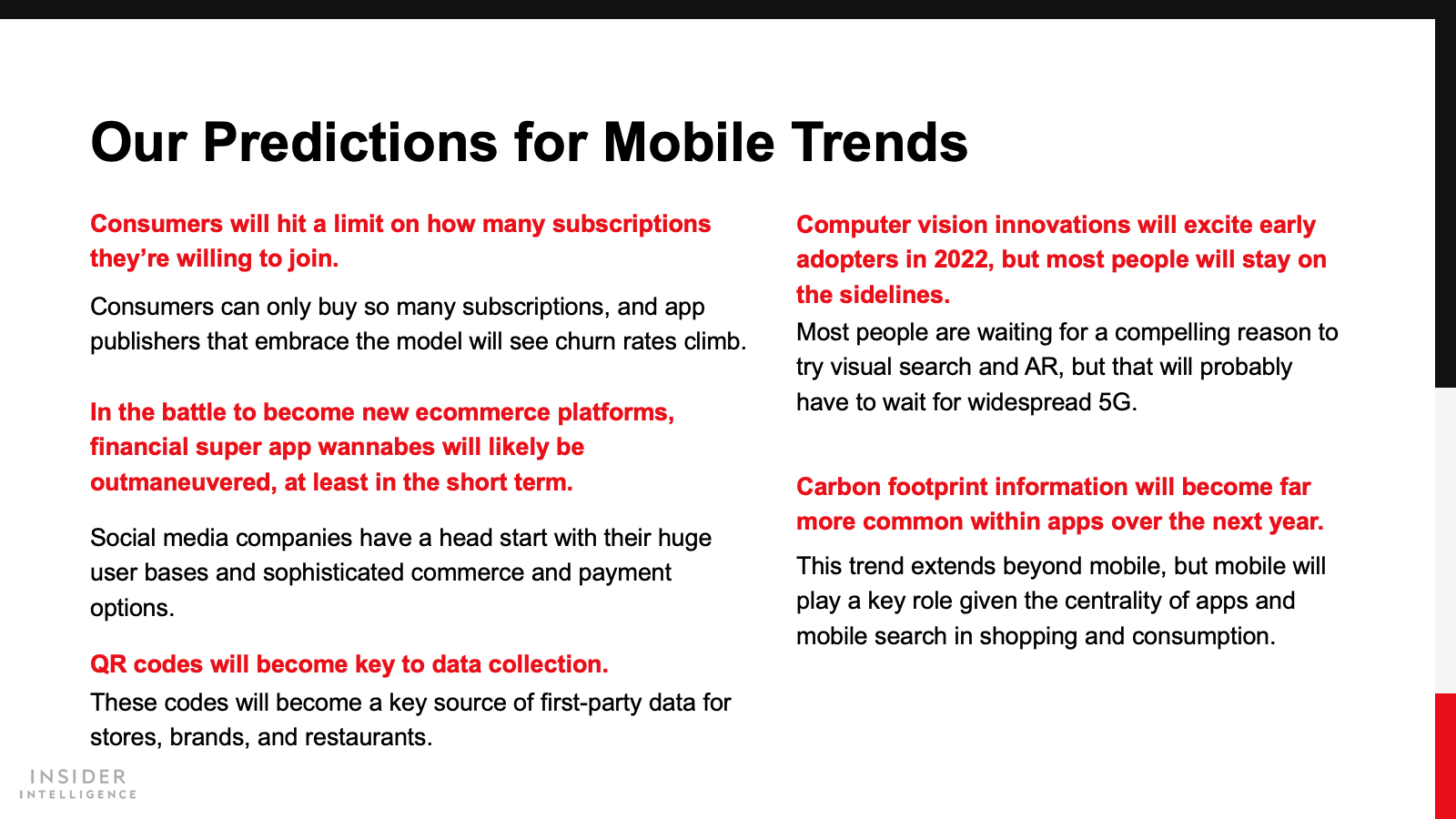 Spurred by changes in mobile advertising, developers will integrate more commerce features into apps in 2022. They’ll add more AR, visual search capabilities, QR codes, and carbon footprint metrics to attract and keep users.