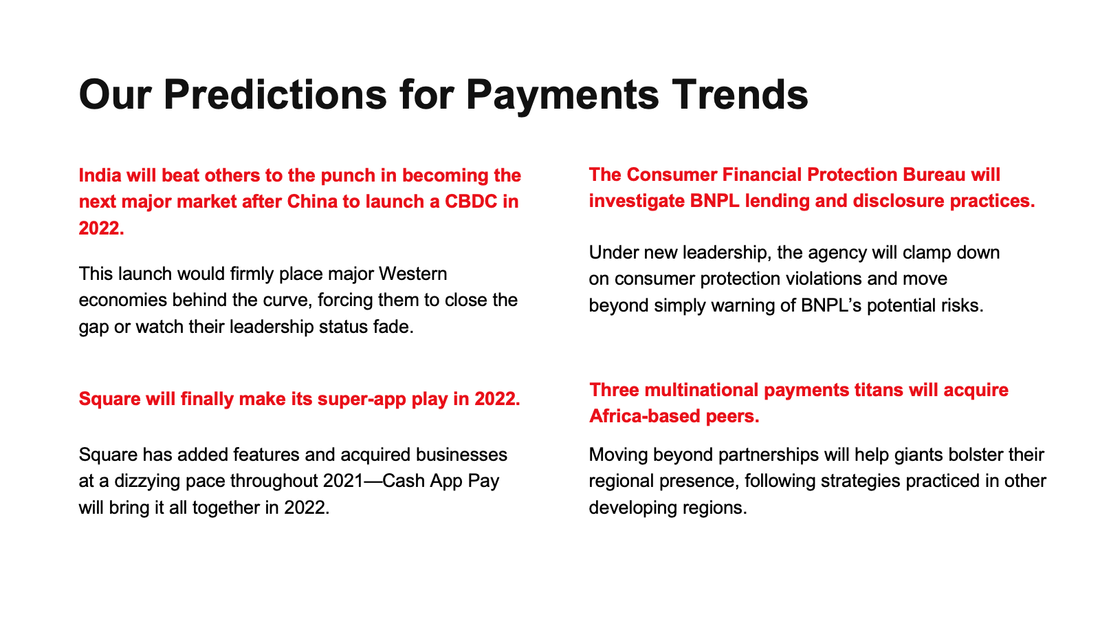 Payments are set to break physical and digital borders in 2022. Innovations will make payments accessible across regions; super apps will address consumers’ financial needs all in one place; and lending will extend credit to once-inaccessible segments.
